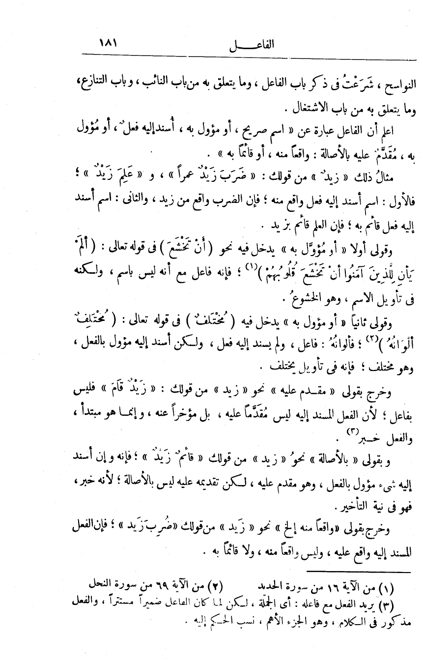فَالْأول اسْم أسْند إِلَيْهِ فعل وَاقع مِنْهُ فَإِن الضَّرْب وَاقع من زيد وَالثَّانِي اسْم أسْند إِلَيْهِ فعل قَائِم بِهِ فَإِن الْعلم قَائِم بزيد وَقَوْلِي أَولا أَو مؤول بِهِ يدْخل فِيهِ نَحْو أَن تخشع فِي قَوْله تَعَالَى ألم يَأن للَّذين آمنُوا أَن تخشع قُلُوبهم فَإِنَّهُ فَاعل مَعَ أَنه لَيْسَ باسم وَلكنه فِي تَأْوِيل الِاسْم وَهُوَ الْخُشُوع وَقَوْلِي ثَانِيًا أَو مؤول بِهِ يدْخل فِيهِ مُخْتَلف فِي قَوْله تَعَالَى مُخْتَلف ألوانه فألوانه فَاعل وَلم يسند إِلَيْهِ فعل وَلَكِن أسْند إِلَيْهِ مؤول بِالْفِعْلِ وَهُوَ مُخْتَلف فَإِنَّهُ فِي تَأْوِيل يخْتَلف وَخرج بِقَوْلِي مقدم عَلَيْهِ نَحْو زيد من قَوْلك زيد قَامَ فَلَيْسَ بفاعل لِأَن الْفِعْل الْمسند إِلَيْهِ لَيْسَ مقدما عَلَيْهِ بل مُؤَخرا عَنهُ وَإِنَّمَا هُوَ مُبْتَدأ وَالْفِعْل خبر وَخرج بِقَوْلِي بِالْأَصَالَةِ نَحْو زايد من قَوْلك قَائِم زيد فَإِنَّهُ وَإِن أسْند اليه شَيْء مؤول بِالْفِعْلِ وَهُوَ مقدم عَلَيْهِ لَكِن تَقْدِيمه عَلَيْهِ لَيْسَ بِالْأَصَالَةِ لِأَنَّهُ خبر فَهُوَ فِي نِيَّة التَّأْخِير وَخرج بِقَوْلِي وَاقعا مِنْهُ إِلَخ نَحْو زيد من قَوْلك ضرب زيد فَإِن الْفِعْل الْمسند إِلَيْهِ وَاقع عَلَيْهِ وَلَيْسَ وَاقعا مِنْهُ وَلَا قَائِما بِهِ