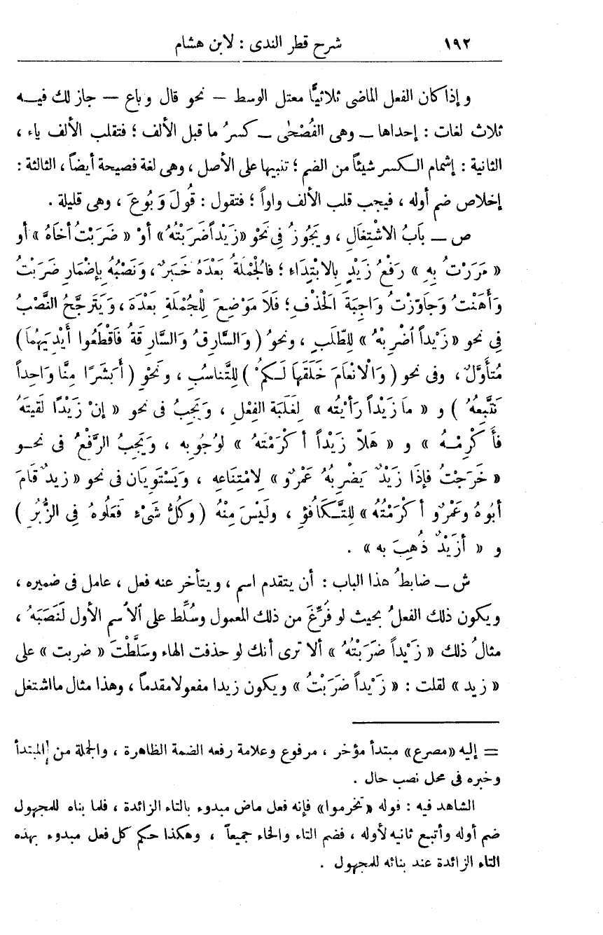 وَإِذا كَانَ الْفِعْل الْمَاضِي ثلاثيا معتل الْوسط نَحْو قَالَ وَبَاعَ جَازَ لَك فِيهِ ثَلَاث لُغَات إِحْدَاهَا وَهِي الفصحى كسر مَا قبل الْألف فنقلب الْألف يَاء الثَّانِيَة إشمام الْكسر شَيْئا من الضَّم تَنْبِيها على الأَصْل وَهِي لُغَة فصيحة أَيْضا الثَّالِثَة اخلاص ضم أَوله فَيجب قلب الْألف واوا فَتَقول قَول وبوع وَهِي قَليلَة