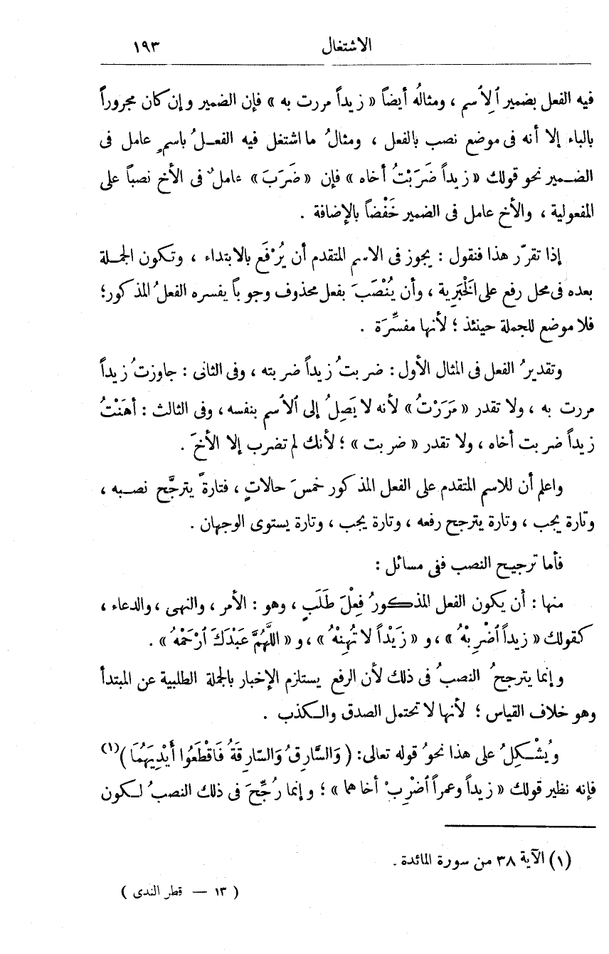 فِيهِ الْفِعْل بضمير الِاسْم ومثاله أَيْضا زيدا مَرَرْت بِهِ فَإِن الضَّمِير وَإِن كَانَ مجرورا بِالْبَاء إِلَّا أَنه فِي مَوضِع نصب بِالْفِعْلِ وَمِثَال مَا اشْتغل فِيهِ الْفِعْل باسم عَامل فِي الضَّمِير نَحْو قَوْلك زيدا ضربت أَخَاهُ فَإِن ضرب عَامل فِي الْأَخ نصبا على المفعولية وَالْأَخ عَامل فِي الضَّمِير خفضا بِالْإِضَافَة إِذا تقرر هَذَا فَتَقول يجوز فِي الِاسْم الْمُتَقَدّم أَن يرفع بِالِابْتِدَاءِ وَتَكون الْجُمْلَة بعده فِي مَحل رفع على الخبرية وَأَن ينصب بِفعل مَحْذُوف وجوبا يفسره الْفِعْل الْمَذْكُور فَلَا مَوضِع للجملة حِينَئِذٍ لِأَنَّهَا مفسرة وَتَقْدِير الْفِعْل فِي الْمِثَال الأول ضربت زيدا ضَربته وَفِي الثَّانِي جَاوَزت زيدا مَرَرْت بِهِ وَلَا تقدر مَرَرْت لِأَنَّهُ لَا يصل إِلَى الِاسْم بِنَفسِهِ وَفِي الثَّالِث أهنت زيدا ضربت أَخَاهُ وَلَا تقدر ضربت لِأَنَّك لم تضرب إِلَّا الْأَخ وَاعْلَم أَن للاسم الْمُتَقَدّم على الْفِعْل الْمَذْكُور خمس حالات فَتَارَة يتَرَجَّح نَصبه وَتارَة يجب وَتارَة يتَرَجَّح رَفعه وَتارَة يجب وَتارَة يَسْتَوِي الْوَجْهَانِ فَأَما تَرْجِيح النصب فَفِي مسَائِل مِنْهَا أَن يكون الْفِعْل الْمَذْكُور فعل طلب وَهُوَ الْأَمر وَالنَّهْي وَالدُّعَاء كَقَوْلِك زيدا اضربه وزيدا لَا تهنه واللهم عَبدك ارحمه وَإِنَّمَا يتَرَجَّح النصب فِي ذَلِك لِأَن الرّفْع يسْتَلْزم الْإِخْبَار بِالْجُمْلَةِ الطلبية عَن الْمُبْتَدَأ وَهُوَ خلاف الْقيَاس لِأَنَّهَا لَا تحْتَمل الصدْق وَالْكذب وَيشكل على هَذَا نَحْو قَوْله تَعَالَى وَالسَّارِق والسارقة فَاقْطَعُوا أَيْدِيهِمَا فَإِنَّهُ نَظِير قَوْلك زيدا وعمرا اضْرِب أخاهما وَإِنَّمَا رجح فِي ذَلِك النصب