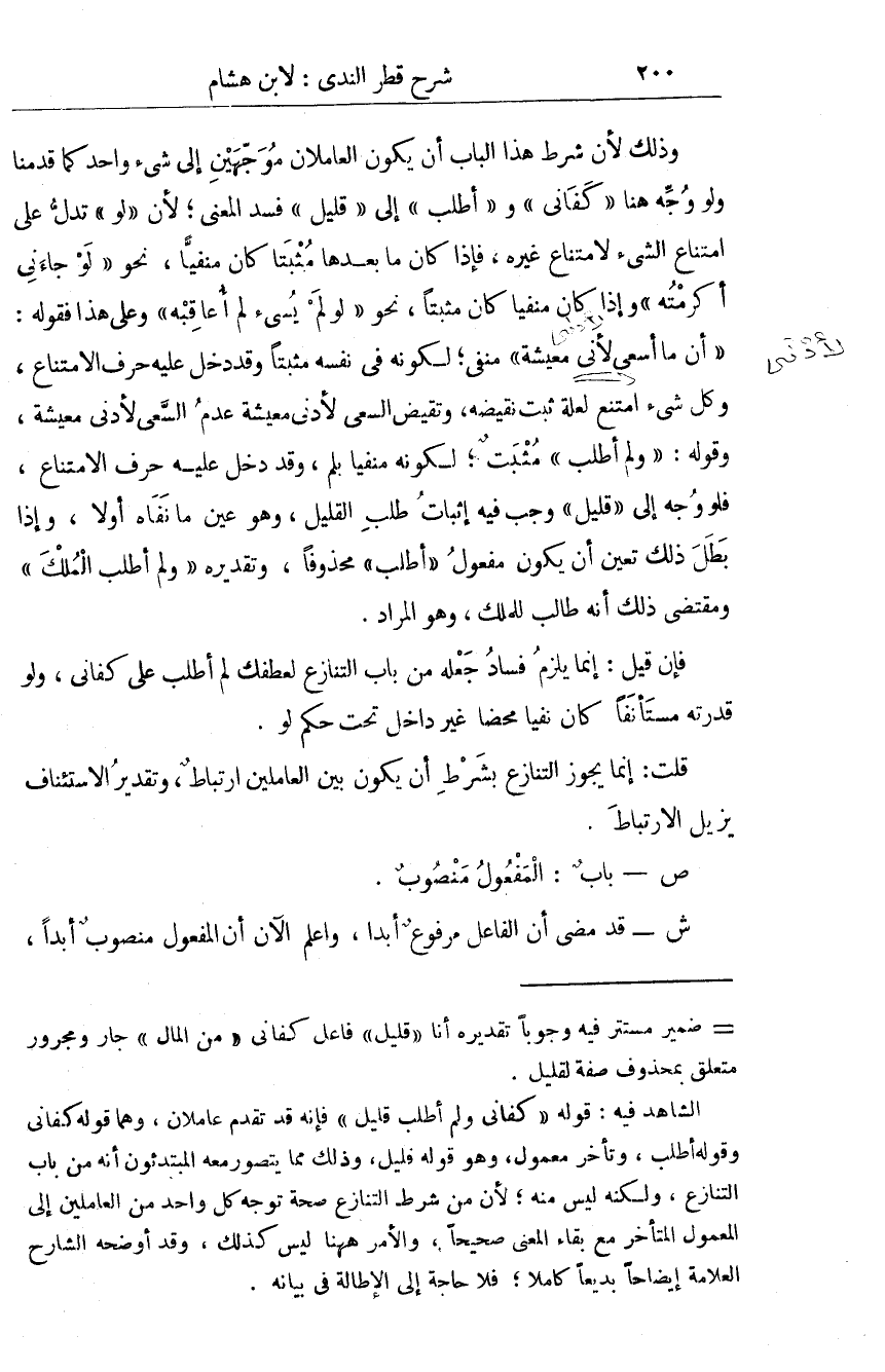 وَذَلِكَ لِأَن شَرط هَذَا الْبَاب أَن يكون العاملان موجهين إِلَى شَيْء وَاحِد كَمَا قدمنَا وَلَو وَجه هُنَا كفاني وأطلب إِلَى قَلِيل فسد الْمَعْنى لَان لَو تدل على امْتنَاع الشَّيْء لِامْتِنَاع غَيره فَإِذا كَانَ مَا بعْدهَا مثبتا كَانَ منفيا نَحْو لَو جَاءَنِي أكرمته وَإِذا كَانَ منفيا كَانَ مثبتا نَحْو لَو لم يسيء لم أعاقبه وعَلى هَذَا فَقَوله أَن مَا أسعى لأدنى معيشة منفي لكَونه فِي نَفسه مثبتا وَقد دخل عَلَيْهِ حرف الِامْتِنَاع وكل شَيْء امْتنع لَعَلَّه ثَبت نقيضه ونقيض السَّعْي لادنى معيشة عدم السَّعْي لأدنى معيشة وَقَوله وَلم أطلب مُثبت لكَونه منفيا بلم وَقد دخل عَلَيْهِ حرف الِامْتِنَاع فَلَو وَجه إِلَى قَلِيل وَجب فِيهِ اثبات طلب الْقَلِيل وَهُوَ عين مَا نَفَاهُ أَولا واذا بَطل ذَلِك تعين أَن يكون مفعول أطلب محذوفا وَتَقْدِيره وَلم أطلب الْملك وَمُقْتَضى ذَلِك أَنه طَالب للْملك وَهُوَ المُرَاد فَإِن قيل إِنَّمَا يلْزم فَسَاد جعله من بَاب التَّنَازُع لعطفك لم أطلب على كفاني وَلَو قدرته مستأنفا كَانَ نفيا مَحْضا غير دَاخل تَحت حكم لَو قلت إِنَّمَا يجوز التَّنَازُع بِشَرْط أَن يكون بَين العاملين ارتباط وَتَقْدِير الِاسْتِئْنَاف يزِيل الارتباط