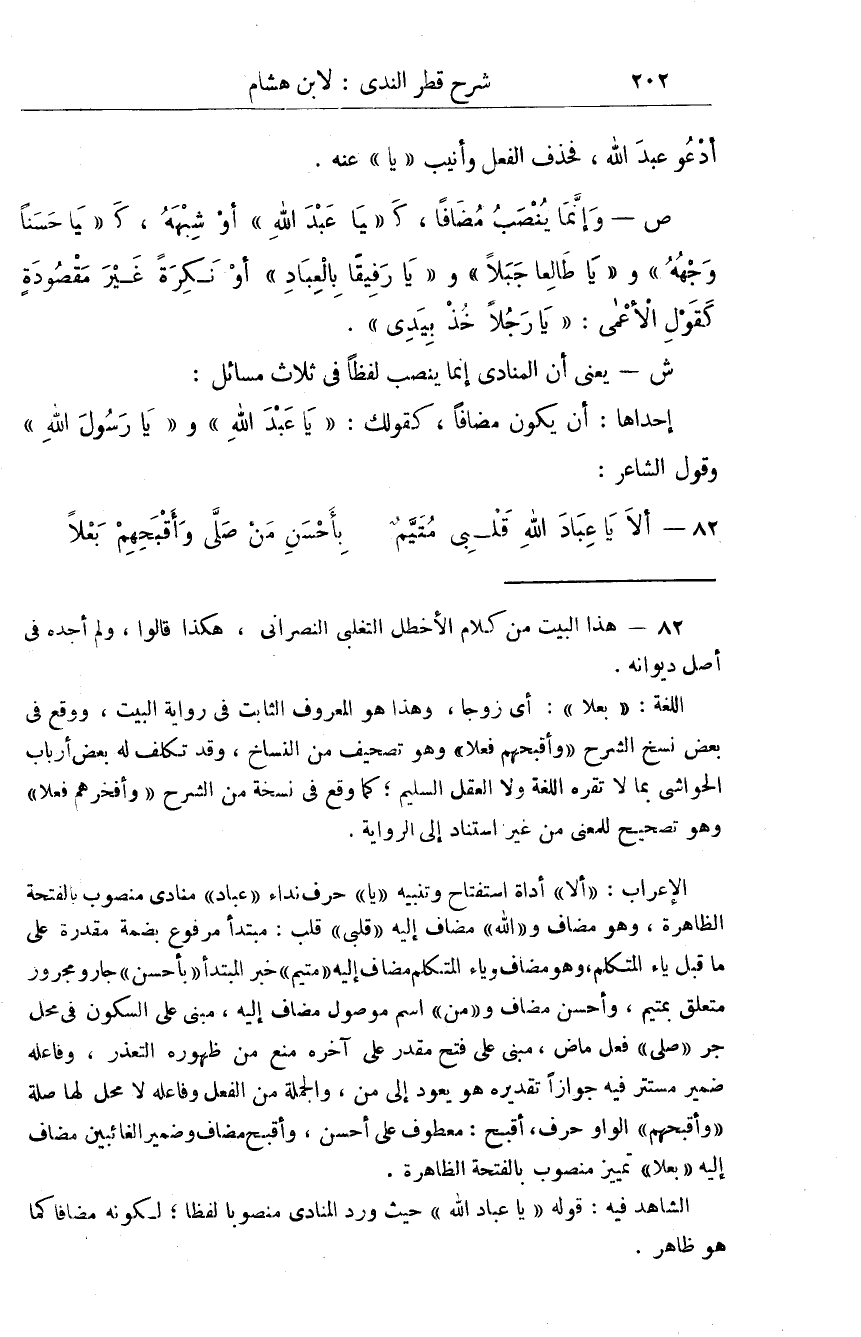 ص وَمِنْه المنادى ش وَمن الْمَفْعُول بِهِ المنادى وَذَلِكَ لِأَن قَوْلك يَا عبد الله أَصله أدعوا عبد الله فَحذف الْفِعْل وأنيب يَا عَنهُ ص وَإِنَّمَا ينصب مُضَافا ك يَا عبد الله أَو شبهه ك يَا حسنا وَجهه وَيَا طالعا جبلا وَيَا رَفِيقًا بالعباد أَو نكرَة غير مَقْصُودَة كَقَوْل الْأَعْمَى يَا رجلا خد بيَدي ش يَعْنِي أَن الْمُنَادِي إِنَّمَا ينصب لفظا فِي ثَلَاث مسَائِل إِحْدَاهَا أَن يكون مُضَافا كَقَوْلِك يَا عبد الله وَيَا رَسُول الله وَقَالَ الشَّاعِر أَلا يَا عباد الله قلبِي متيم بِأَحْسَن من صلى وأقبحهم بعلا
