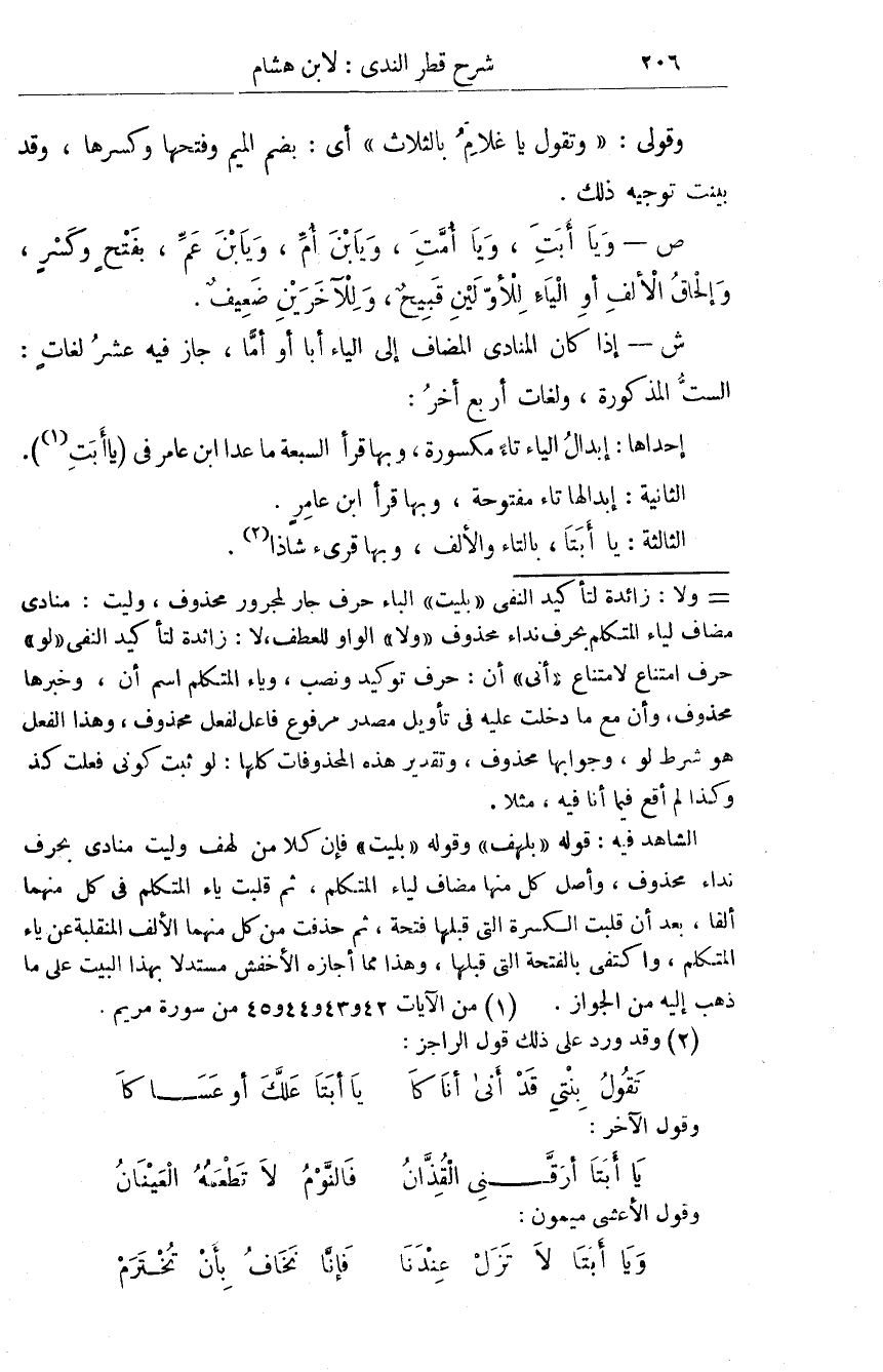 وَقَوْلِي وَتقول يَا غُلَام بِالثلَاثِ أَي بِضَم الْمِيم وَفتحهَا وَكسرهَا وَقد بيّنت تَوْجِيه ذَلِك ص وَيَا أَبَت وَيَا أمت ويابن أم وَيَا بن عَم بِفَتْح وَكسر وإلحاق الْألف أَو الْيَاء للأولين قَبِيح وللآخرين ضَعِيف ش إِذا كَانَ المنادى الْمُضَاف إِلَى الْيَاء أَبَا أَو أما جَازَ فِيهِ عشر لُغَات السِّت الْمَذْكُورَة ولغات أَربع أخر إِحْدَاهَا إِبْدَال الْيَاء تَاء مَكْسُورَة وَبهَا قَرَأَ السَّبْعَة مَا عدا ابْن عَامر فِي يَا أَبَت الثَّانِيَة إبدالها تَاء مَفْتُوحَة وَبهَا قَرَأَ ابْن عَامر الثَّالِثَة يَا أبتا بِالتَّاءِ وَالْألف وَبهَا قرئَ شاذا