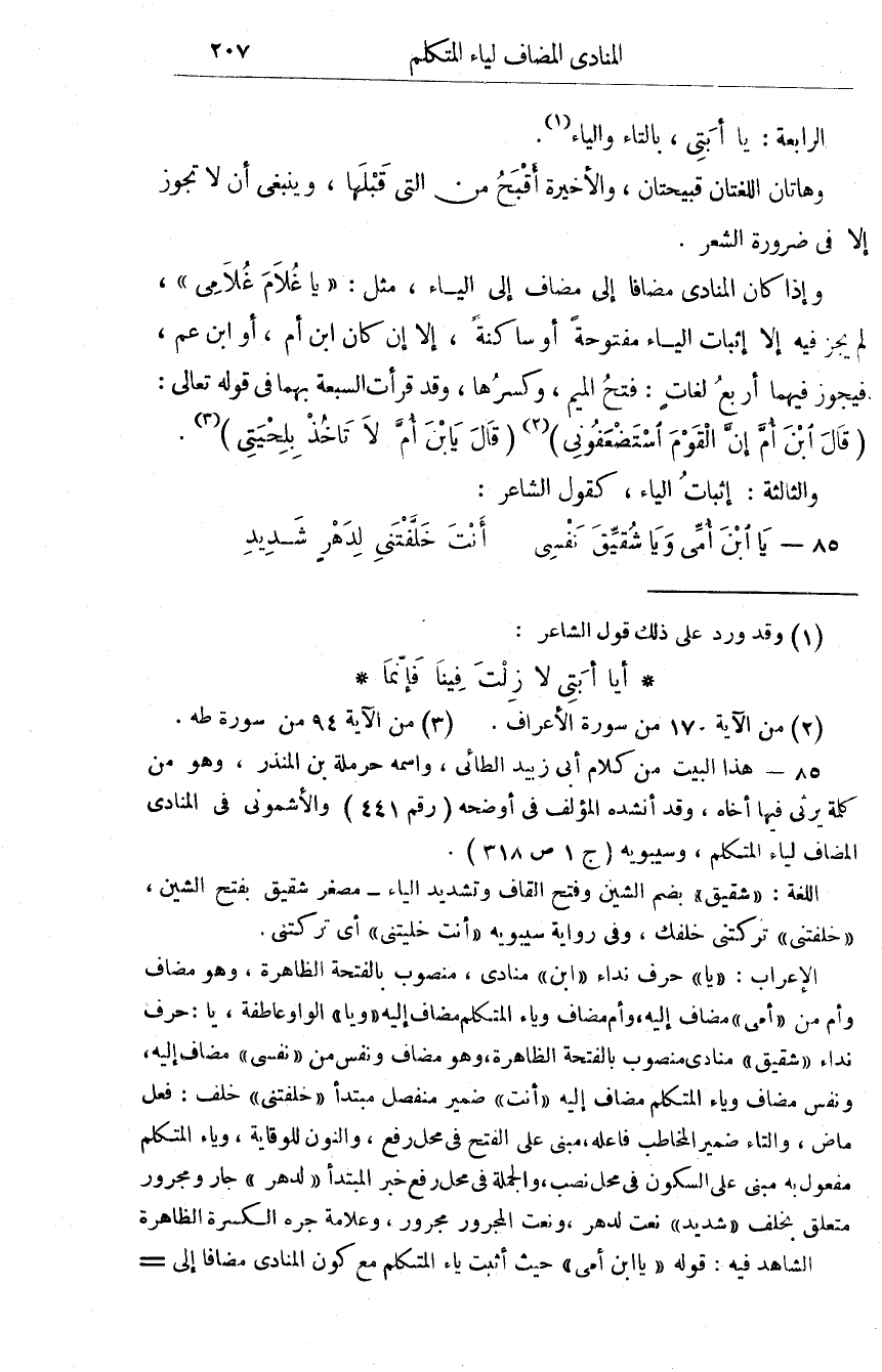 الرَّابِعَة يَا أبتي بِالتَّاءِ وَالْيَاء وَهَاتَانِ اللغتان قبيحتان والأخيرة أقبح من الَّتِي قبلهَا وَيَنْبَغِي أَن لَا تجوز إِلَّا فِي ضَرُورَة الشّعْر وَإِذا كَانَ المنادى مُضَافا إِلَى مُضَاف إِلَى الْيَاء مثل يَا غُلَام غلامي لَا يجز فِيهِ الا اثبات الْيَاء مَفْتُوحَة أَو سَاكِنة إِلَّا إِن كَانَ ابْن أم أَو ابْن عَم فَيجوز فيهمَا أَربع لُغَات فتح الْمِيم وَكسرهَا وَقد قَرَأت السَّبْعَة بهما فِي قَوْله تَعَالَى قَالَ ابْن أم إِن الْقَوْم استضعفوني قَالَ يَابْنَ أم لَا تَأْخُذ بلحيتي وَالثَّالِثَة اثبات الْيَاء كَقَوْل الشَّاعِر يَا بن أُمِّي وَيَا شَقِيق نَفسِي أَنْت خلفتني لدهر شَدِيد