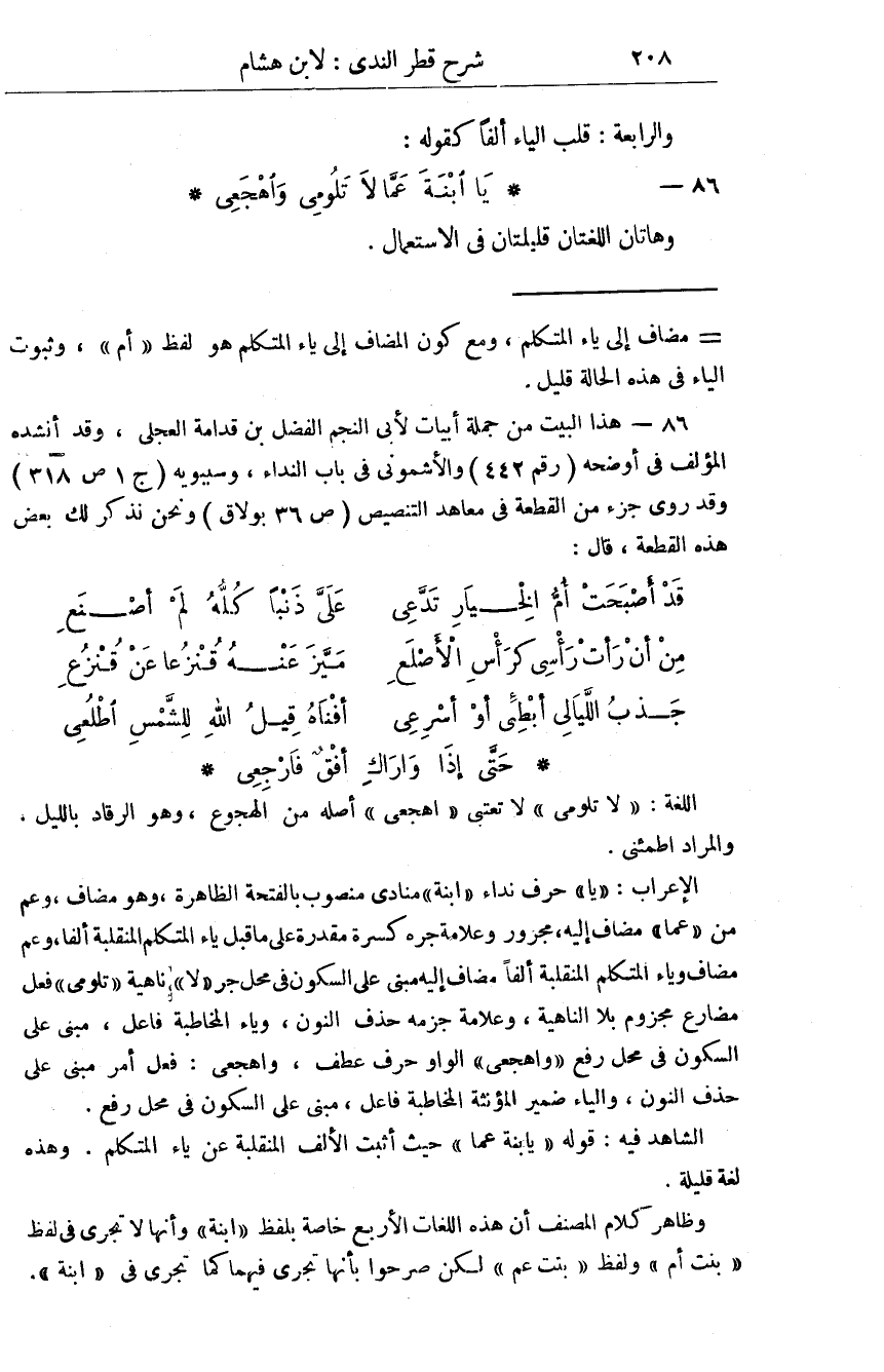 وَالرَّابِعَة قلب الْيَاء ألفا كَقَوْلِه يَا بنة عَمَّا لَا تلومي واهجعي وَهَاتَانِ اللغتان قليلتان فِي الِاسْتِعْمَال