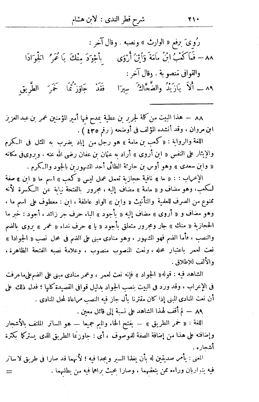 رُوِيَ بِرَفْع الْوَارِث ونصبه وَقَالَ الآخر فَمَا كَعْب ابْن مامه وَابْن أروى بأجود مِنْك يَا عمر الجوادا والقوافي مَنْصُوبَة وَقَالَ آخر أَلا يَا زيد وَالضَّحَّاك سيرا فقد جاوزتما خمر الطَّرِيق