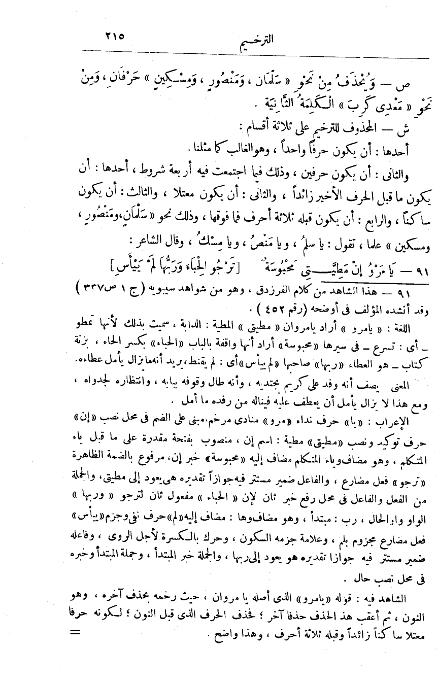 ص ويحذف من نَحْو سلمَان وَمَنْصُور ومسكين حرفان وَمن نَحْو معدى كرب الْكَلِمَة الثَّانِيَة ش الْمَحْذُوف للترخيم على ثَلَاثَة أَقسَام أَحدهمَا أَن يكون حرفا وَاحِدًا وَهُوَ الْغَالِب كَمَا مثلنَا وَالثَّانِي أَن يكون حرفين وَلَك فِيمَا اجْتمعت فِيهِ أَرْبَعَة شُرُوط أَحدهَا أَن يكون مَا قبل الْحَرْف الْأَخير زَائِدا وَالثَّانِي مُعْتَلًّا وَالثَّالِث أَن يكون سَاكِنا وَالرَّابِع أَن يكون قبله ثَلَاثَة أحرف فَمَا فَوْقهَا وَذَلِكَ نَحْو سلمَان وَمَنْصُور ومسكين علما تَقول يَا سلم وَيَا منص وَيَا مسك وَقَالَ الشَّاعِر يامرو إِن مطيتي محبوسة ترجو الحباء وربها لم ييأس
