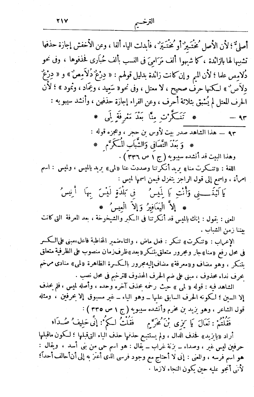 أُصَلِّي لِأَن الأَصْل مختير أَو مختير فأبدلت الْيَاء ألفا وَعَن الاخفش إجَازَة حذفهَا تَشْبِيها لَهَا بالزائدة كَمَا شبهوا ألف مرامى فِي النّسَب بِأَلف حبارى فحذفوها وَفِي نَحْو دلامص علما لِأَن الْمِيم وَإِن كَانَت زَائِدَة بِدَلِيل قَوْلهم درع دلامص وَدرع دلاص وَلكنهَا حرف صَحِيح لَا معتل وَفِي نَحْو سعيد وعماد وَثَمُود لِأَن الْحَرْف المعتل لم يسْبق بِثَلَاثَة أحرف وَعَن الْفراء إجَازَة حذفهن وَأنْشد سِيبَوَيْهٍ تنكرت منا بعد معرفَة لمى