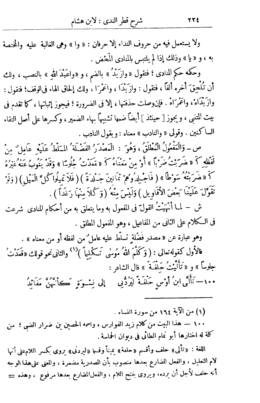 ص وَالْمَفْعُول الْمُطلق وَهُوَ الْمصدر الفضلة الْمُسَلط عَلَيْهِ عَامل من لَفْظَة ك ضربت ضربا أَو من مَعْنَاهُ ك قعدت جُلُوسًا وَقد يَنُوب عَنهُ غَيره ك ضَربته سَوْطًا فَاجْلِدُوهُمْ ثَمَانِينَ جلدَة فَلَا تميلوا كل الْميل وَلَو تَقول علينا بعض الْأَقَاوِيل وَلَيْسَ مِنْهُ وكلا مِنْهَا رغدا ش لما أنهيت القَوْل فِي الْمَفْعُول بِهِ وَمَا يتَعَلَّق بِهِ من أَحْكَام المنادى شرعت فِي الْكَلَام على الثَّانِي من المفاعيل وَهُوَ الْمَفْعُول الْمُطلق وَهُوَ عبارَة عَن مصدر فضلَة تسلط عَلَيْهِ عَامل من لَفظه أَو من مَعْنَاهُ فَالْأول كَقَوْلِه تَعَالَى وكلم الله مُوسَى تكليما وَالثَّانِي نَحْو قَوْلك قعدت جُلُوسًا وتأليت حلفه قَالَ الشَّاعِر تألى ابْن أَوْس حلفة ليردني إِلَى نسْوَة كأنهن مفائد