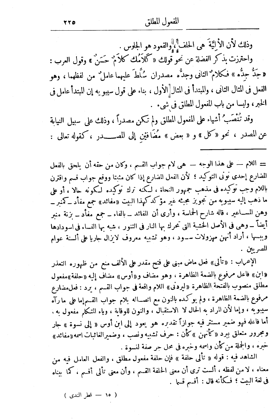 وَذَلِكَ لِأَن الألية هِيَ الْحلف وَالْقعُود هُوَ الْجُلُوس واحترزت بِذكر الفضلة عَن نَحْو قَوْلك كلامك كَلَام حسن وَقَول الْعَرَب جد جده فَكَلَام الثَّانِي وجده مصدران سلط عَلَيْهِمَا عَامل من لَفْظهمَا وَهُوَ الْفِعْل فِي الْمِثَال الثَّانِي والمبتدأ فِي الْمِثَال الأول بِنَاء على قَول سِيبَوَيْهٍ إِن الْمُبْتَدَأ عَامل فِي الْخَبَر وَلَيْسَ من بَاب الْمَفْعُول الْمُطلق فِي شَيْء وَقد تنصب أَشْيَاء على الْمَفْعُول الْمُطلق وَلم تكن مصدرا وَذَلِكَ على سَبِيل النِّيَابَة عَن الْمصدر نَحْو كل وَبَعض مضافين إِلَى الْمصدر كَقَوْلِه تَعَالَى