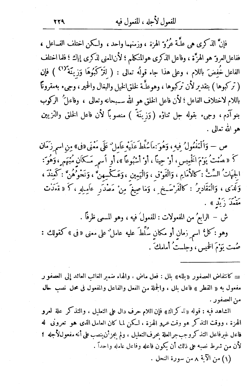 فَإِن الذكرى هِيَ عِلّة عرو الهزة وزمنها وَاحِد وَلَكِن اخْتلف الْفَاعِل ففاعل العرو هُوَ الهزة وفاعل الذكرى هُوَ الْمُتَكَلّم لِأَن الْمَعْنى لذكرى إياك فَلَمَّا اخْتلف الْفَاعِل خفض بِاللَّامِ وعَلى هَذَا جَاءَ قَوْله تَعَالَى لتركبوها وزينة فَإِن تركبوها بِتَقْدِير لِأَن تركبوها وَهُوَ عِلّة لخلق الْخَيل وَالْبِغَال وَالْحمير وَجِيء بِهِ مَقْرُونا بِاللَّامِ لاخْتِلَاف الْفَاعِل لِأَن فَاعل الْخلق هُوَ الله سُبْحَانَهُ وَتَعَالَى وفاعل الرّكُوب بَنو آدم وَجِيء بقوله جلّ ثَنَاؤُهُ وزينة مَنْصُوبًا لِأَن فَاعل الْخلق والتزيين هُوَ الله تَعَالَى