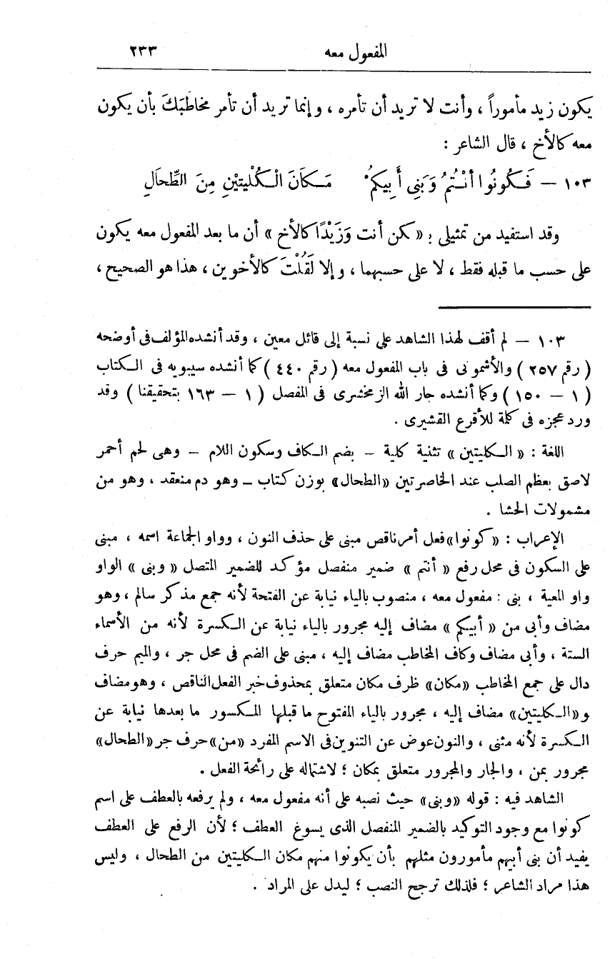 يكون زيد مَأْمُورا وَأَنت لَا تُرِيدُ أَن تَأمره وَإِنَّمَا تُرِيدُ أَن تامر مخاطبك بِأَن يكون مَعَه كالأخ قَالَ الشَّاعِر فكونوا أَنْتُم وَبني أبيكم مَكَان الكليتين من الطحال وَقد اسْتُفِيدَ من تمثيلي ب كن أَنْت وزيدا كالأخ أَن مَا بعد الْمَفْعُول مَعَه يكون على حسب مَا قبله فَقَط لَا على حسبهما وَإِلَّا لَقلت كالأخوين هَذَا هُوَ الصَّحِيح