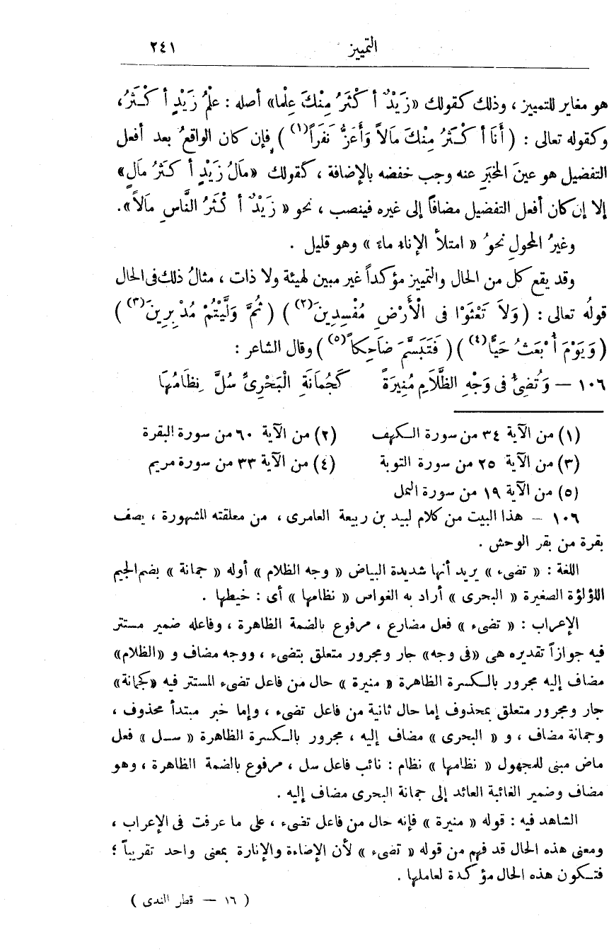 هُوَ مُغَاير للتمييز وَذَلِكَ كَقَوْلِك زيد أَكثر مِنْك علما أَصله علم زيد أَكثر وَكَقَوْلِه تَعَالَى أَنا أَكثر مِنْك مَالا وأعز نَفرا فَإِن كَانَ الْوَاقِع بعد أفعل التَّفْضِيل هُوَ عين الْمخبر عَنهُ وَجب خفضه بِالْإِضَافَة كَقَوْلِك مَال زيد أَكثر مَالا إِلَّا أَن كَانَ أفعل التَّفْضِيل مُضَافا إِلَى غَيره فينصب نَحْو زيد أَكثر النَّاس مَالا وَقد يَقع كل من الْحَال والتمييز مؤكدا غير مُبين لهيئة وَلَا ذَات مِثَال ذَلِك فِي الْحَال قَوْله تَعَالَى وَلَا تعثوا فِي الأَرْض مفسدين ثمَّ وليتم مُدبرين وَيَوْم أبْعث حَيا فَتَبَسَّمَ ضَاحِكا وَقَالَ الشَّاعِر وتضيء فِي وَجه الظلام منيرة كجمانة البحري سل نظمها