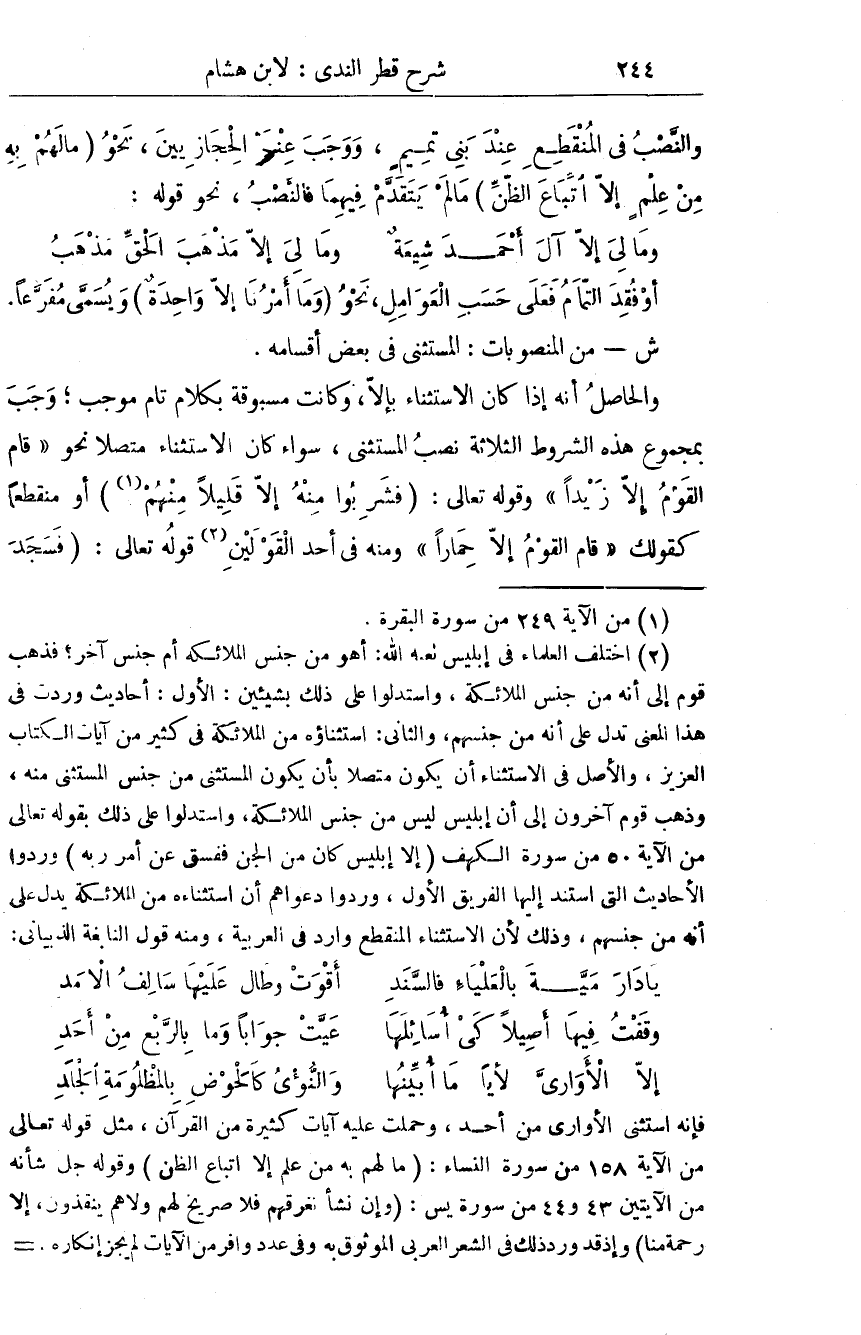 مِنْهُم وَالنّصب فِي الْمُنْقَطع عِنْد بني تَمِيم وَجب عِنْد الْحِجَازِيِّينَ نَحْو مَا لَهُم بِهِ من علم إِلَّا اتِّبَاع الظَّن مَا لم يتَقَدَّم فيهمَا فالنصب نَحْو قَوْله وَمَا لي إِلَّا آل أَحْمد شيعَة وَمَالِي إِلَّا مَذْهَب الْحق مَذْهَب أَو فقد التَّمام فعلى حسب العوامل نَحْو وَمَا أمرنَا إِلَّا وَاحِدَة وَيُسمى مفرغا ش من المنصوبات الْمُسْتَثْنى فِي بعض أقسامه وَالْحَاصِل أَنه إِذا كَانَ الِاسْتِثْنَاء بإلا وَكَانَت مسبوقة بِكَلَام تَامّ وَمُوجب وَجب بِمَجْمُوع هَذِه الشُّرُوط الثَّلَاثَة نصب الْمُسْتَثْنى سَوَاء كَانَ الِاسْتِثْنَاء مُتَّصِلا نَحْو قَامَ الْقَوْم إِلَّا زيدا وَقَوله تَعَالَى فَشَرِبُوا مِنْهُ إِلَّا قَلِيلا مِنْهُم أَو مُنْقَطِعًا كَقَوْلِك قَامَ الْقَوْم إِلَّا حمارا وَمِنْه فِي أحد الْقَوْلَيْنِ