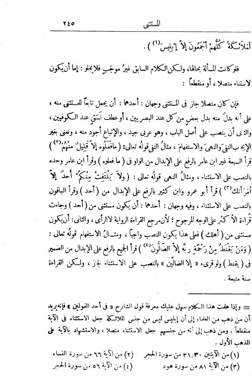قَوْله تَعَالَى فَسجدَ الْمَلَائِكَة كلهم أَجْمَعُونَ إِلَّا إِبْلِيس فَلَو كَانَت الْمَسْأَلَة بِحَالِهَا وَلَكِن الْكَلَام السَّابِق غير مُوجب فَلَا يَخْلُو إِمَّا أَن يكون الِاسْتِثْنَاء مُتَّصِلا أَو مُنْقَطِعًا فَإِن كَانَ مُتَّصِلا جَازَ فِي الْمُسْتَثْنى وَجْهَان أَحدهمَا أَن يَجْعَل تَابعا للمستثنى مِنْهُ على أَن بدل مِنْهُ بدل بعض من كل عِنْد الْبَصرِيين أَو عطف نسق عِنْد الْكُوفِيّين الثَّانِي أَن ينصب على أصل الْبَاب وَهُوَ عَرَبِيّ جيد والإتباع أَجود مِنْهُ ونعني بِغَيْر الْإِيجَاب النَّفْي وَالنَّهْي والاستفهام مِثَال النَّفْي قَوْله تَعَالَى مَا فَعَلُوهُ إِلَّا قَلِيل مِنْهُم وَقَرَأَ السَّبْعَة غير ابْن عَامر بِالرَّفْع على الْإِبْدَال من الْوَاو فِي مَا فَعَلُوهُ وَقَرَأَ ابْن عَامر وَحده بِالنّصب على الِاسْتِثْنَاء وَمِثَال النَّهْي قَوْله تَعَالَى وَلَا يلْتَفت مِنْكُم أحد إِلَّا امْرَأَتك قَرَأَ أَبُو عَمْرو وَابْن كثير بِالرَّفْع على الْإِبْدَال من أحد وَقَرَأَ الْبَاقُونَ بِالنّصب على الِاسْتِثْنَاء وَفِيه وَجْهَان أَحدهمَا أَن يكون مُسْتَثْنى من أحد وَجَاءَت قِرَاءَة الْأَكْثَر على الْوَجْه الْمَرْجُوح لِأَن مرجع الْقِرَاءَة الرِّوَايَة لَا الرَّأْي وَالثَّانِي أَن يكون مُسْتَثْنى من أهلك فعلى هَذَا يكون النصب وَاجِبا وَمِثَال الِاسْتِفْهَام قَوْله تَعَالَى وَمن يقنط من رَحْمَة ربه إِلَّا الضالون قَرَأَ الْجَمِيع بِالرَّفْع على الْإِبْدَال من الضَّمِير فِي يقنط وَلَو قرئَ الضَّالّين بِالنّصب على الِاسْتِثْنَاء لجَاز وَلَكِن الْقِرَاءَة سنة متبعة