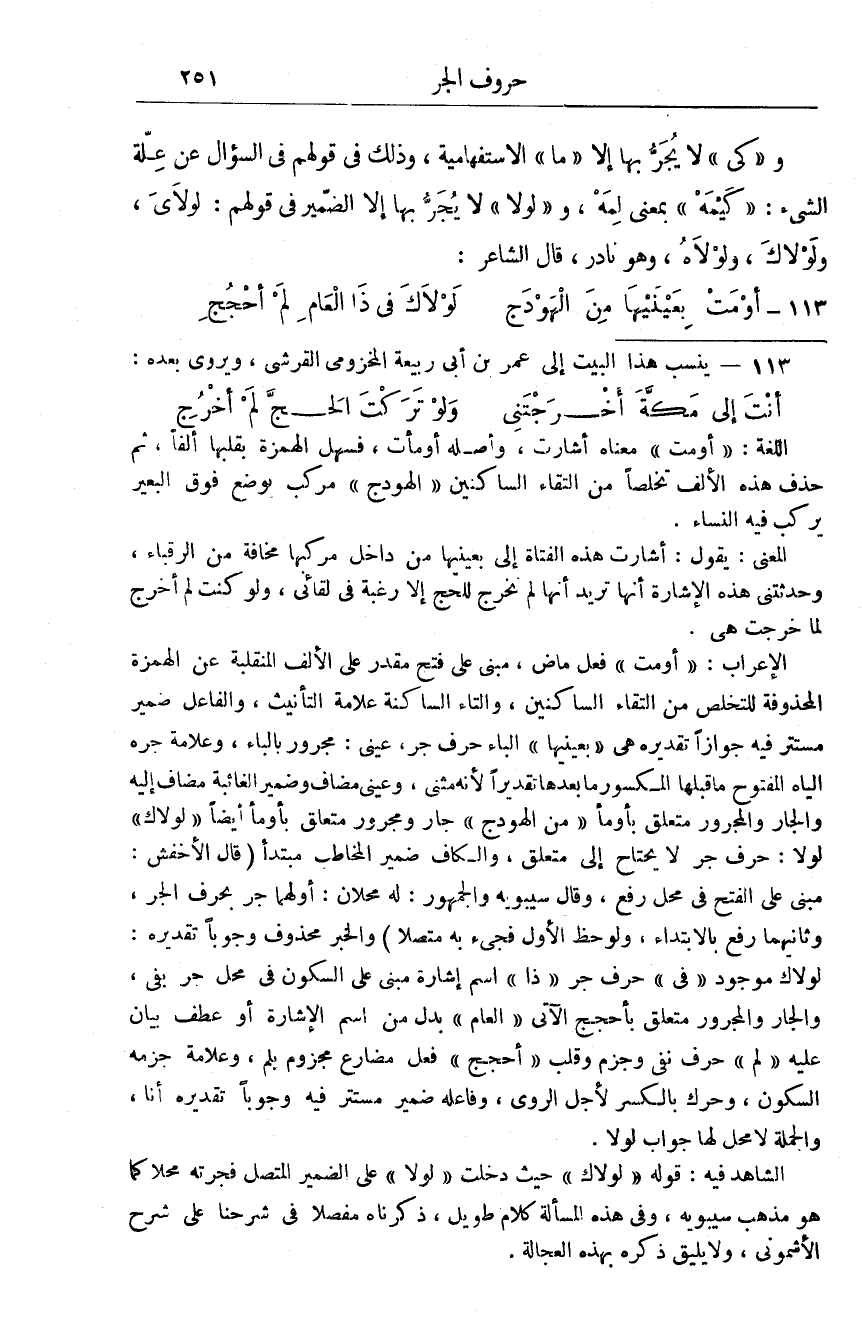 وكي لَا يجر بهَا إِلَّا مَا الاستفهامية وَذَلِكَ فِي قَوْلهم فِي السُّؤَال عَن عِلّة الشَّيْء كيمه بِمَعْنى لمه وَلَوْلَا لَا يجر بهَا إِلَّا الضَّمِير فِي قَوْلهم لولاي ولولاك ولولاه وَهُوَ نَادِر قَالَ الشَّاعِر أومت بعينيها من الهودج لولاك فِي ذَا الْعَام لم أحجج