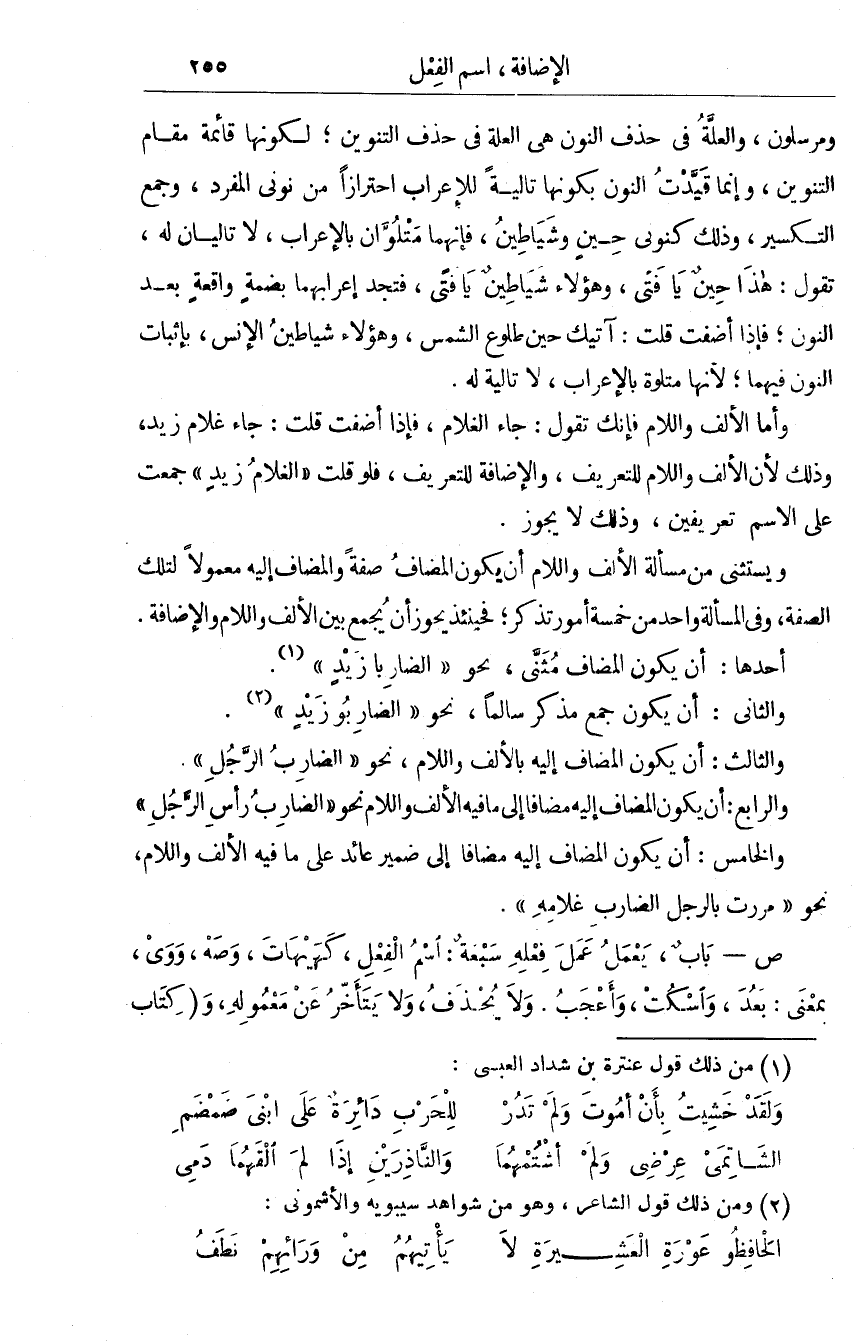 ومرسلون وَالْعلَّة فِي حذف النُّون هِيَ الْعلَّة فِي حذف التَّنْوِين لكَونهَا قَائِمَة مقَام التَّنْوِين وَإِنَّمَا قيدت النُّون بِكَوْنِهَا تالية للإعراب احْتِرَازًا من نوني الْمُفْرد وَجمع التكسير وَكَذَلِكَ كنوني حِين وشياطين فَإِنَّهَا متلوان بالأعراب تاليان لَهُ تَقول هَذَا حِين يَا فَتى وَهَؤُلَاء شياطين يَا فَتى فتجد اعرابهما بضمة وَاقعَة بعد النُّون فَإِذا أضفت قلت آتِيك حِين طُلُوع الشَّمْس وَهَؤُلَاء شياطين الْإِنْس بِإِثْبَات النُّون فيهمَا لِأَنَّهَا متلوة بالاعراب لَا تأليه لَهُ وَأما الْألف وَاللَّام فَإنَّك تَقول جَاءَ الْغُلَام فَإِذا أضفت قلت جَاءَ غُلَام زيد وَذَلِكَ لِأَن الْألف وَاللَّام للتعريف والاضافة للتعريف فَلَو قلت الْغُلَام زيد جمعت على الِاسْم تعريفين وَذَلِكَ لَا يجوز وَيسْتَثْنى من مَسْأَلَة الْألف وَاللَّام أَن يكون الْمُضَاف صفة والمضاف اليه مَعْمُولا لتِلْك الصّفة وَفِي الْمَسْأَلَة وَاحِد من خَمْسَة أُمُور تذكر فَحِينَئِذٍ يجوز ان يجمع بَين الْألف وَاللَّام وَالْإِضَافَة أَحدهَا أَن يكون الْمُضَاف مثنى نَحْو الضاربا زيد الثَّانِي أَن يكون الْمُضَاف جمع مُذَكّر سالما نَحْو الضاربو زيد الثَّالِث أَن يكون الْمُضَاف اليه بِالْألف وَاللَّام نَحْو الضَّارِب الرجل الرَّابِع أَن يكون الْمُضَاف اليه مُضَافا إِلَى مَا فِيهِ الْألف وَاللَّام نَحْو الضَّارِب رَأس الرجل الْخَامِس ان يكون الْمُضَاف إِلَيْهِ مُضَافا إِلَى ضمير عَائِد على مَا فِيهِ الالف وَاللَّام نَحْو مَرَرْت بِالرجلِ الضَّارِب غُلَامه