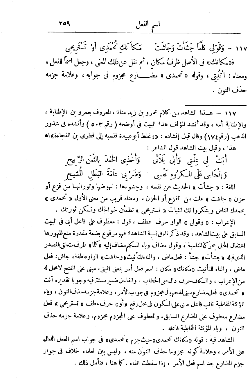 وَقَوْلِي كلما جشأت وجاشت مَكَانك تحمدي أَو تستريجي ف مَكَانك فِي الأَصْل ظرف مَكَان ثمَّ نقل عَن ذَلِك الْمَعْنى وَجعل اسْما للْفِعْل وَمَعْنَاهُ اثبتي وَقَوله تحمدي مضارع مجزوم فِي جَوَابه وعلامة جزمه حذف النُّون