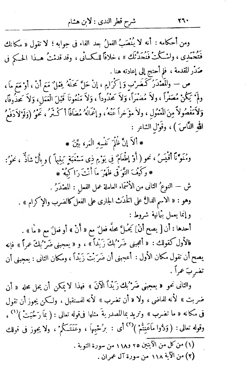 ص والمصدر كضرب واكرام ان حل مَحَله فعل مَعَ أَن أَو مَعَ مَا وَلم يكن مُصَغرًا وَلَا مضمرا وَلَا محدودا وَلَا منعوتا قبل الْعَمَل وَلَا محذوفا وَلَا مَفْصُولًا من الْمَعْمُول وَلَا مُؤَخرا عَنهُ واعماله مُضَافا أَكثر نَحْو وَلَوْلَا دفع الله النَّاس وَقَول الشَّاعِر أَلا أَن ظلم نَفسه الْمَرْء بَين ومنونا أَقيس نَحْو اطعام فِي يَوْم ذِي مسغبة يَتِيما وبأل شَاذ نَحْو وَكَيف التوقي ظهر مَا أَنْت رَاكِبه ش النَّوْع الثَّانِي من الْأَسْمَاء العاملة عمل الْفِعْل الْمصدر وَهُوَ الِاسْم الدَّال على الْحَدث الْجَارِي على الْفِعْل كالضرب وَالْإِكْرَام وَإِنَّمَا يعْمل بِثمَانِيَة شُرُوط أَحدهَا أَن يَصح أَن يحل مَحَله فعل مَعَ أَن أَو فعل مَعَ مَا فَالْأول كَقَوْلِك أعجبني ضربك زيدا ويعجبني ضربك عمرا فَإِنَّهُ يَصح أَن تَقول مَكَان الأول اعجبني أَن ضربت زيدا وَمَكَان الثَّانِي يُعجبنِي أَن تضرب عمرا وَالثَّانِي نَحْو يُعجبنِي ضربك زيدا الْآن فَهَذَا لَا يُمكن أَن يحل مَحَله أَن ضربت لانه للماضي وَلَا أَن تضرب لانه للمستقبل وَلَكِن يجوز أَن تَقول فِي مَكَانَهُ مَا تضرب وتريد بِمَا المصدرية مثلهَا فِي قَوْله تَعَالَى بِمَا رَحبَتْ وَقَوله تَعَالَى ودوا مَا عنيتم أَي برحبها وعنتكم وَلَا يجوز فِي قَوْلك