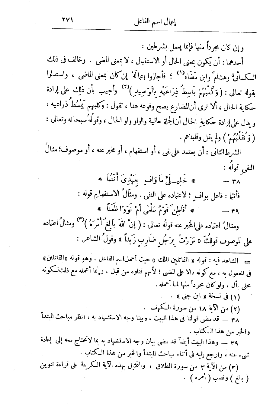 وان كَانَ مُجَردا مِنْهَا فَإِنَّمَا يعْمل بِشَرْطَيْنِ أَحدهمَا أَن يكون بِمَعْنى الْحَال أَو الِاسْتِقْبَال لَا بِمَعْنى الْمُضِيّ وَخَالف فِي ذَلِك الْكسَائي وَهِشَام وَابْن مضاء فأجازوا اعماله أَن كَانَ بِمَعْنى الْمَاضِي وَاسْتَدَلُّوا بقوله تَعَالَى وكلبهم باسط ذِرَاعَيْهِ بالوصيد واجيب بِأَن ذَلِك على ارادة حِكَايَة الْحَال أَلا ترى أَن الْمُضَارع يَصح وُقُوعه هُنَا تَقول وكلبهم يبسط ذِرَاعَيْهِ وَيدل على ارادة حِكَايَة الْحَال أَن الْجُمْلَة حَالية وَالْوَاو وَاو الْحَال وَقَوله سُبْحَانَهُ وَتَعَالَى ونقلبهم وَلم يقل وقلبناهم الشَّرْط الثَّانِي ان يعْتَمد على نفي اَوْ اسْتِفْهَام أَو مخبر عَنهُ أَو مَوْصُوف مِثَال النَّفْي قَوْله خليلي مَا واف بعهدي أَنْتُمَا فأنتما فَاعل بواف لاعتماده على النَّفْي وَمِثَال الِاسْتِفْهَام قَوْله أقاطن قوم سلمى أم نووا طَعنا وَمِثَال اعْتِمَاده على الْمخبر عَنهُ قَوْله تَعَالَى ان الله بَالغ أمره وَمِثَال اعْتِمَاده على الْمَوْصُوف قَوْلك مَرَرْت بِرَجُل ضَارب زيدا وَقَول الشَّاعِر