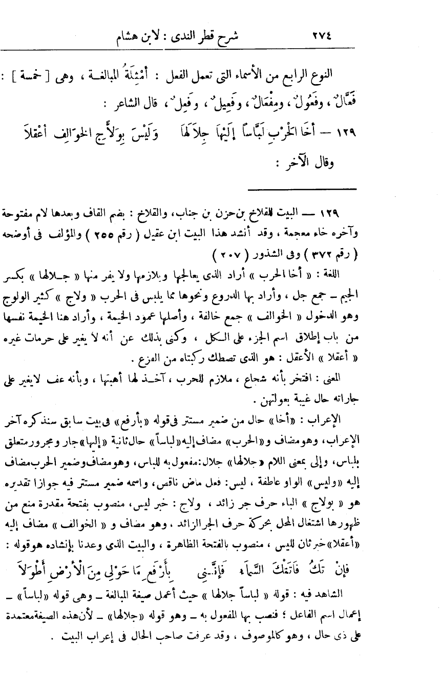النَّوْع الرَّابِع من الْأَسْمَاء الَّتِي تعْمل عمل الْفِعْل أَمْثِلَة الْمُبَالغَة وَهِي خَمْسَة فعال وفعول وفعيل وَفعل قَالَ الشَّاعِر أَخا الْحَرْب لباسا إِلَيْهَا جبلالها وَلَيْسَ بولاج الْخَوَالِف أعقلا وَقَالَ الآخر