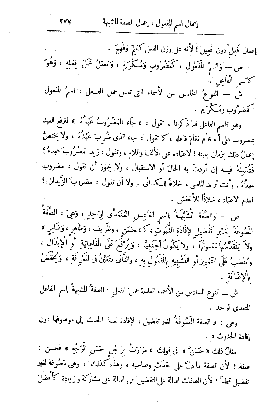 ص وَالصّفة المشبهة باسم الْفَاعِل الْمُتَعَدِّي لوَاحِد وَهِي الصّفة المصوغة لغير تَفْضِيل لإِفَادَة الثُّبُوت ك حسن وظريف وطاهر وضامر وَلَا يتقدمها معمولها وَلَا يكون أَجْنَبِيّا وَيرْفَع على الفاعلية أَو الْإِبْدَال وَينصب على التَّمْيِيز أَو التَّشْبِيه بالمفعول بِهِ وَالثَّانِي يتَعَيَّن فِي الْمعرفَة ويخفض بِالْإِضَافَة ش النَّوْع السَّادِس من الْأَسْمَاء العاملة عمل الْفِعْل الصّفة المشبهة باسم الْفَاعِل الْمُتَعَدِّي لوَاحِد وَهِي الصّفة المصوغة لغير تَفْضِيل لإِفَادَة نِسْبَة الْحَدث إِلَى موصوفها دون افادة الْحُدُوث مِثَال ذَلِك حسن فِي قَوْلك مَرَرْت بِرَجُل حسن الْوَجْه فَحسن صفة لِأَن الصّفة مَا دلّ على حدث وَصَاحبه وَهَذِه كَذَلِك وَهِي مصوغة لغير تَفْضِيل قطعا لِأَن الصِّفَات الدَّالَّة على التَّفْضِيل هِيَ الدَّالَّة على مُشَاركَة
