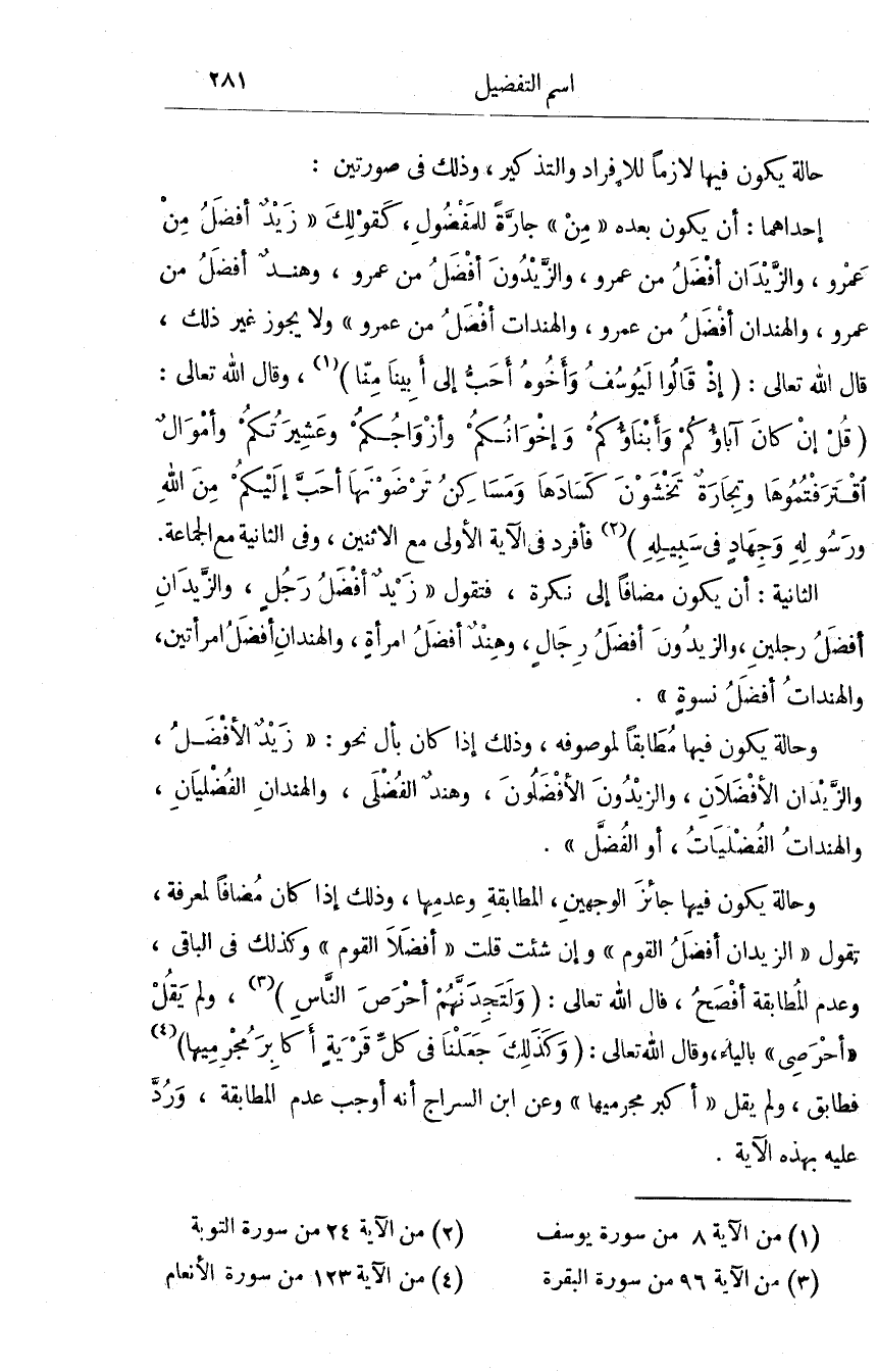وَله ثَلَاث حالات حَالَة يكون فِيهَا لَازِما للإفراد والتذكير وَذَلِكَ فِي صُورَتَيْنِ إِحْدَاهمَا أَن يكون بعده من جَارة للمفضول كَقَوْلِك زيد أفضل من عَمْرو والزيدان أفضل من عَمْرو والزيدان أفضل من عَمْرو والزيدون أفضل من عَمْرو وَهِنْد أفضل من عَمْرو والهندان أفضل من عَمْرو والهندات أفضل من عَمْرو وَلَا يجوز غير ذَلِك قَالَ الله تَعَالَى إِذْ قَالُوا ليوسف وَأَخُوهُ أحب إِلَى أَبينَا منا وَقَالَ الله تَعَالَى قل إِن كَانَ آباؤكم وأبناؤكم وأزواجكم وعشيرتكم وأموال اقترفتموها وتجارة تخشون كسادها ومساكن ترضونها أحب إِلَيْكُم من الله وَرَسُوله وَجِهَاد فِي سَبيله فأفرد فِي الْآيَة الأولى مَعَ الِاثْنَيْنِ وَفِي الثَّانِيَة مَعَ الْجَمَاعَة الثَّانِيَة أَن يكون مُضَافا إِلَى نكرَة فَتَقول زيد أفضل رجل والزيدان أفضل رجلَيْنِ والزيدون أفضل رجال وَهِنْد أفضل امْرَأَة والهندان أفضل امْرَأتَيْنِ والهندات أفضل نسْوَة وَحَالَة يكون فِيهَا مطابقا لموصوفه وَذَلِكَ إِذا كَانَ بأل نَحْو زيد الأفض والزيدان الأفضلان والزيدون الأفضون وَهِنْد الفضلى والهندان الفضليان والهندات الفضليات أَو الْفضل وَحَالَة يكون فِيهَا جَائِز الْوَجْهَيْنِ الْمُطَابقَة وَعدمهَا وَذَلِكَ إِذا كَانَ مُضَافا لمعْرِفَة تَقول الزيدان أفضل الْقَوْم وَإِن شِئْت قلت أفضلا الْقَوْم وَكَذَلِكَ فِي الْبَاقِي وَعدم الْمُطَابقَة أفْصح قَالَ الله تَعَالَى ولتجدنهم أحرص النَّاس وَلم يقل أحرصي بِالْيَاءِ وَقَالَ الله تَعَالَى وَكَذَلِكَ جعلنَا فِي كل قَرْيَة أكَابِر مجرميها فطابق وَلم يقل أكبر مجرميها وَعَن ابْن السراج انه أوجب عدم الْمُطَابقَة ورد عَلَيْهِ بِهَذِهِ الْآيَة