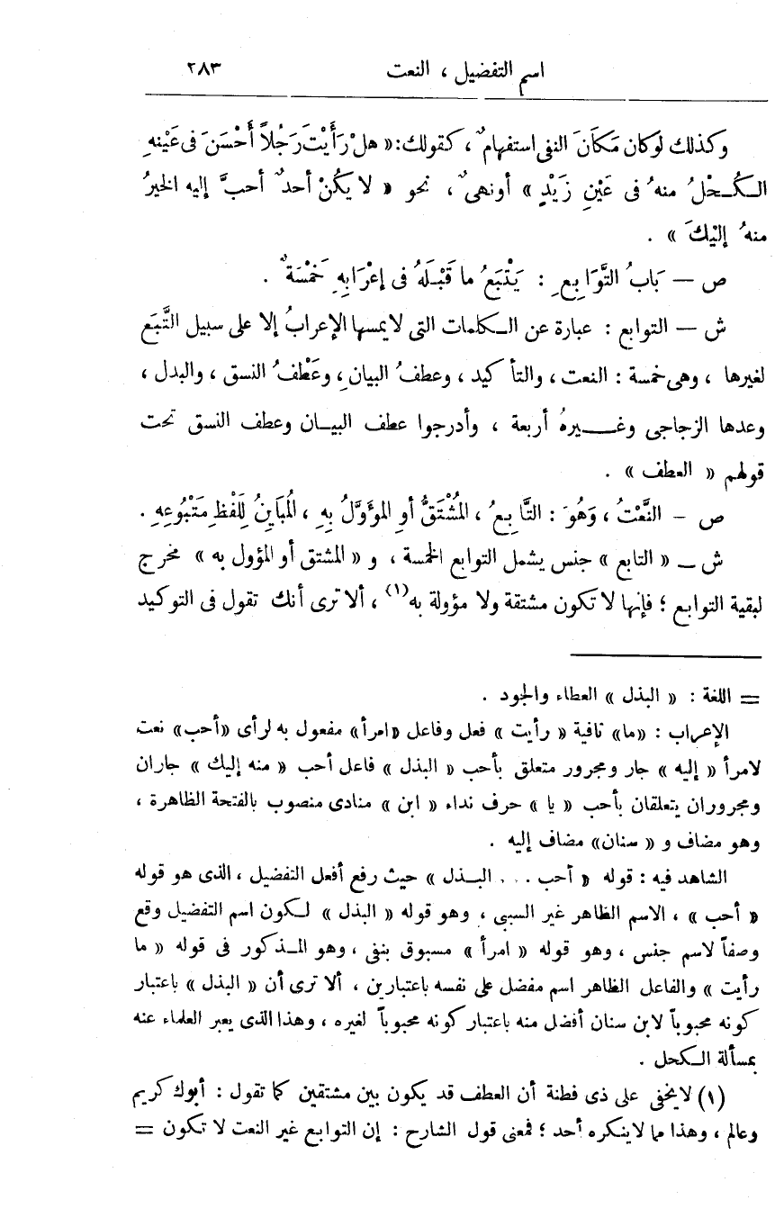 النَّعْت والتأكيد وَعطف الْبَيَان وَعطف النسق وَالْبدل وعدها الزجاجي وَغَيره أَرْبَعَة وأدرجوا عطف الْبَيَان وَعطف النسق تَحت قَوْلهم الْعَطف ص النَّعْت وَهُوَ التَّابِع الْمُشْتَقّ أَو المؤول بِهِ المباين للفظ متبوعه ش التَّابِع جنس يَشْمَل التوابع الْخَمْسَة والمشتق أَو المؤول بِهِ مخرج لبَقيَّة التوابع فَإِنَّهَا لَا تكون مُشْتَقَّة وَلَا مؤولة بِهِ أَلا ترى أَنَّك تَقول