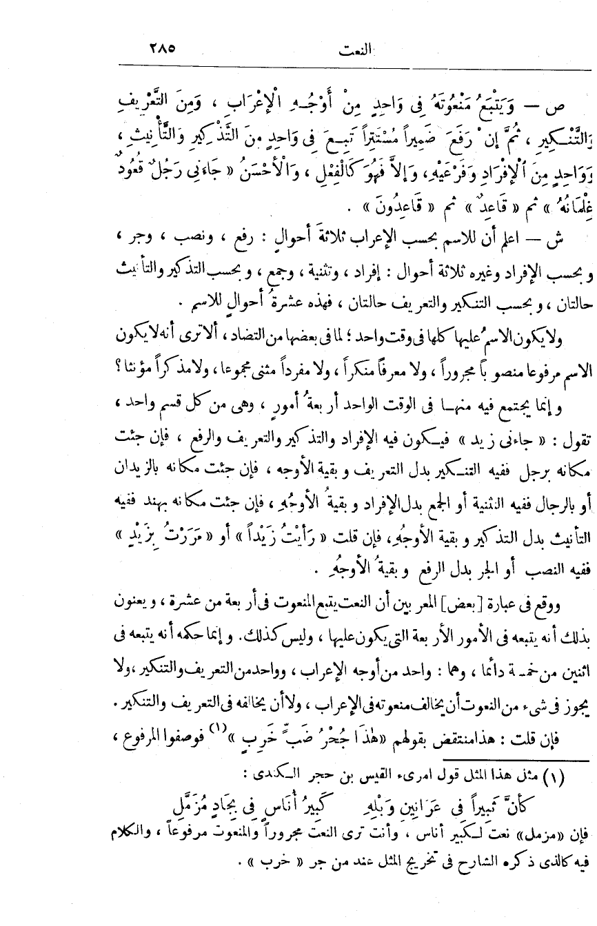 ص وَيتبع منعوته فِي وَاحِد من أوجه الْإِعْرَاب وَمن التَّعْرِيف والتنكير ثمَّ إِن رفع ضميرا مستترا تبع فِي وَاحِد من التَّذْكِير والتأنيث وَوَاحِد من الْإِفْرَاد وفرعيه وَإِلَّا فَهُوَ كالفعل وَالْأَحْسَن جَاءَنِي رجل قعُود غلمانه ثمَّ قَاعد ثمَّ قَاعِدُونَ ش اعْلَم أَن للاسم بِحَسب الْإِعْرَاب ثَلَاثَة أَحْوَال رفع وَنصب وجر وبحسب الافراد وَغَيره ثَلَاثَة أَحْوَال افراد وتثنية وَجمع وبحسب التَّذْكِير والتأنيث حالتان وبحسب التنكير والتعريف حالتان فَهَذِهِ عشرَة أَحْوَال للاسم وَلَا يكون الِاسْم عَلَيْهَا كلهَا فِي وَقت وَاحِد لما فِي بَعْضهَا من التضاد أَلا ترى أَنه لَا يكون الِاسْم مَرْفُوعا مَنْصُوبًا مجرورا وَلَا مُعَرفا مُنْكرا وَلَا مُفردا مثنى مجموعا وَلَا مذكرا مؤنثا وَإِنَّمَا يجْتَمع فِيهِ مِنْهَا فِي الْوَقْت الْوَاحِد أَرْبَعَة أُمُور وَهِي من كلك قسم وَاحِد تَقول جَاءَنِي زيد فَيكون فِيهِ الافراد والتذكير والتعريف وَالرَّفْع فَإِن جِئْت مَكَانَهُ بِرَجُل فَفِيهِ التنكير بدل التَّعْرِيف وَبَقِيَّة الْأَوْجه فَإِن جِئْت مَكَانَهُ بالزيدان أَو بِالرِّجَالِ فَفِيهِ التَّثْنِيَة أَو الْجمع بدل الْإِفْرَاد وَبَقِيَّة الْأَوْجه فَإِن جِئْت مَكَانَهُ بهند فَفِيهِ التَّأْنِيث بدل التَّذْكِير وَبَقِيَّة الْأَوْجه فَإِن قلت رَأَيْت زيدا أَو مَرَرْت بزيد فَفِيهِ النصب أَو الْجَرّ بدل الرّفْع وَبَقِيَّة الْأَوْجه وَوَقع فِي عبارَة بعض المعربين أَن النَّعْت يتبع المنعوت فِي أَرْبَعَة من عشرَة ويعنون بذلك أَنه يتبعهُ فِي الْأُمُور الْأَرْبَعَة الَّتِي يكون عَلَيْهَا وَلَيْسَ كَذَلِك وَإِنَّمَا حكمه ان يتبعهُ فِي اثْنَيْنِ من خَمْسَة دَائِما وهما وَاحِد من أوجه الاعراب وَوَاحِد من التَّعْرِيف والتنكير وَلَا يجوز فِي شَيْء من النعوت أَن يُخَالف منعوته فِي الْإِعْرَاب وَلَا ان يُخَالِفهُ فِي التَّعْرِيف والتنكير فَإِن قلت هَذَا منتقض بقَوْلهمْ هَذَا جُحر ضَب خرب فوصفوا الْمَرْفُوع