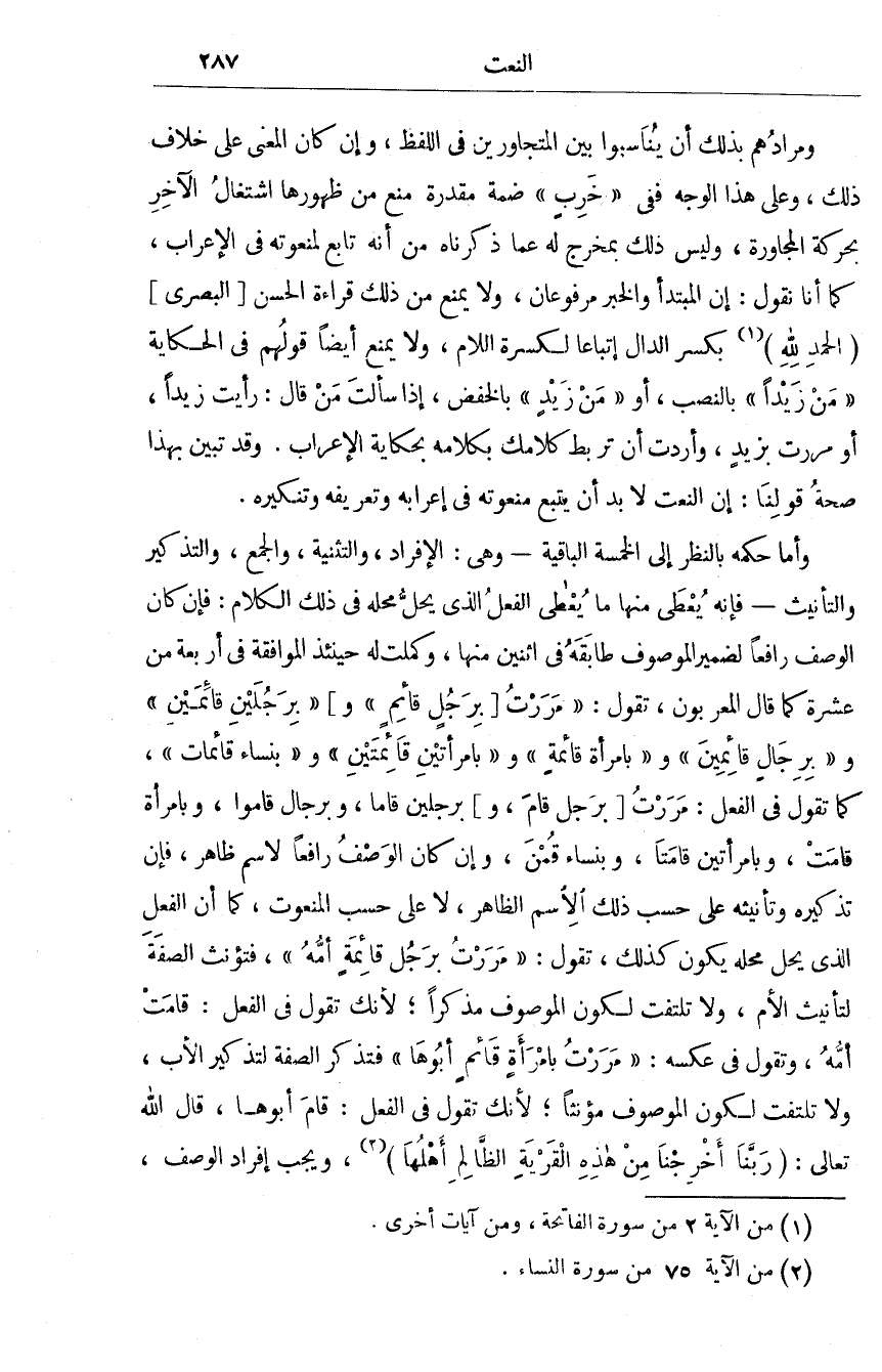 ومرادهم بذلك أَن يناسبوا بَين المتجاورين فِي اللَّفْظ وَإِن كَانَ الْمَعْنى على خلاف ذَلِك وعَلى هَذَا الْوَجْه فَفِي خرب ضمة مقدرَة منع من ظُهُورهَا اشْتِغَال الآخر بحركة الْمُجَاورَة وَلَيْسَ ذلم بمخرج لَهُ عَمَّا ذَكرْنَاهُ من انه تَابع لمنعوته فِي الاعراب كَمَا أَن نقُول إِن الْمُبْتَدَأ وَالْخَبَر مرفوعان وَلَا يمْنَع من ذَلِك قِرَاءَة الْحسن البصرى الْحَمد لله بِكَسْر الدَّال إتباعا لكسرة اللَّام وَلَا يمْنَع من ذَلِك أَيْضا قَوْلهم من الْحِكَايَة من زيدا بِالنّصب أَو من زيد بالخفض إِذا سَأَلت من قَالَ رَأَيْت زيدا أَو مَرَرْت بزيد وَأَرَدْت أَن ترْبط كلامك بِكَلَامِهِ بحكاية الاعراب وَقد تبين بِهَذَا صِحَة قَوْلنَا إِن النَّعْت لَا بُد أَن يتبع منعوته فِي إعرابه وتعريفه وتنكيره وَأما حكمه بِالنّظرِ إِلَى الْخَمْسَة الْبَاقِيَة وَهِي الْأَفْرَاد والتثنية وَالْجمع والتذكير والتأنيث فَإِنَّهُ يعْطى مِنْهَا مَا يعْطى الْفِعْل الَّذِي يحل مَحَله فِي ذَلِك الْكَلَام فَإِن كَانَ الْوَصْف رَافعا لضمير الْمَوْصُوف طابقه فِي اثْنَيْنِ مِنْهَا وكملت لَهُ حِينَئِذٍ الْمُوَافقَة فِي أَرْبَعَة من عشرَة كَمَا قَالَ المعربون تَقول مَرَرْت بِرَجُل قَائِم وبرجلين قَائِمين وبرجال قَائِمين وبامرأة قَائِمَة وبامرأتين قائمتين وبنساء قائمات كَمَا تَقول فِي الْفِعْل مَرَرْت بِرَجُل قَامَ وبرجلين قاما وبرجال قَامُوا وبامرأة قَامَت وبامرأتين قامتا وبنساء قمن وَإِن كَانَ الْوَصْف رَافعا لاسم ظَاهر فَإِن تذكيره وتأنيثه على حسب ذَلِك الِاسْم الظَّاهِر لَا على حسب المنعوت كَمَا أَن الْفِعْل الَّذِي يحل مَحَله يكون كَذَلِك تَقول مَرَرْت بِرَجُل قَائِمَة أمه فتؤنث الصّفة لتأنيث الام وَلَا تلْتَفت لكَون الْمَوْصُوف مذكرا لِأَنَّك تَقول فِي الْفِعْل قَامَت أمه وَتقول فِي عَكسه مَرَرْت بِامْرَأَة قَائِم أَبوهَا فَتذكر الصّفة لتذكر الاب وَلَا تلْتَفت لكَون الْمَوْصُوف مؤنثا لِأَنَّك تَقول فِي الْفِعْل قَامَ أَبوهَا قَالَ الله تَعَالَى رَبنَا أخرجنَا من هَذِه الْقرْيَة الظَّالِم أَهلهَا وَيجب إِفْرَاد الْوَصْف وَلَو كَانَ فَاعله مثنى