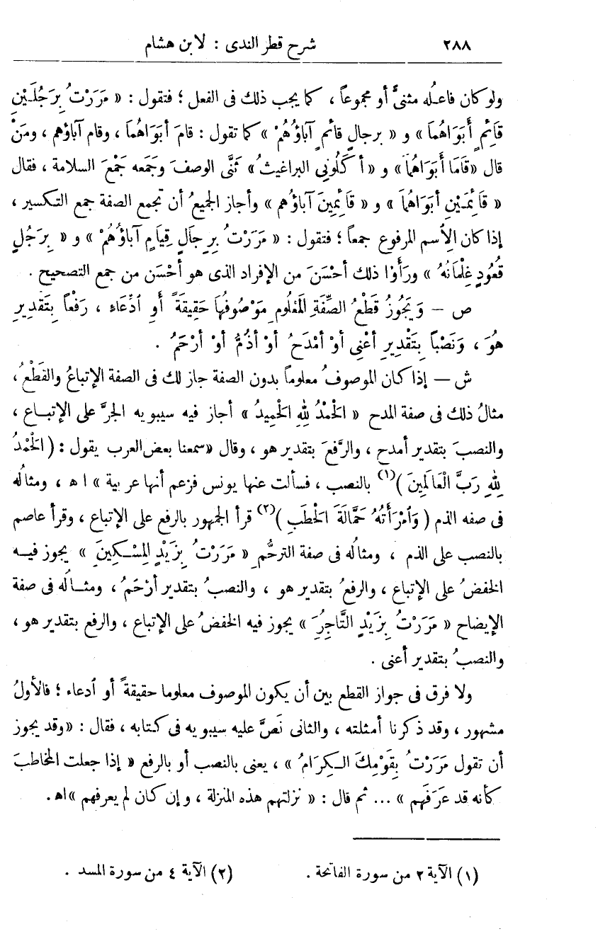 أَو مجموعا كَمَا يجب ذَلِك فِي الْفِعْل فَتَقول مَرَرْت برجللين قَائِم أبواهما وبرجال قَائِم آباؤهم كَمَا تَقول قَامَ أبواهما وَقَامَ آباؤهم وَمن قَالَ قاما أبواهما وأكلوني البراغيث ثنى الْوَصْف وَجمعه جمع السَّلامَة فَقَالَ قَائِمين آبواهما قَائِمين آباؤهم وَأَجَازَ الْجَمِيع أَن تجمع الصّفة جمع التكسير إِذا كَانَ الِاسْم الْمَرْفُوع جمعا فَتَقول مَرَرْت بِرِجَال قيام آباؤهم وبرجل قعُود غلمانه وَرَأَوا ذَلِك أحسن من الْأَفْرَاد الَّذِي هُوَ أحسن من جمع التَّصْحِيح ص وَيجوز قطع الصّفة الْمَعْلُوم موصوفها حَقِيقَة أَو ادِّعَاء رفعا بِتَقْدِير هُوَ ونصبا بِتَقْدِير اعني أَو امدح أَو اذم أَو أرْحم ش إِذا كَانَ الْمَوْصُوف مَعْلُوما بِدُونِ الصّفة جَازَ لَك س فِي الصّفة الإتباع وَالْقطع مِثَال ذَلِك فِي صفة الْمَدْح الْحَمد لله الحميد اجاز فِيهِ سِيبَوَيْهٍ الْجَرّ على الإتباع وَالنّصب بِتَقْدِير امدح وَالرَّفْع بِتَقْدِير هُوَ وَقَالَ سمعنَا بعض الْعَرَب يَقُول الْحَمد لله رب الْعَالمين بِالنّصب فَسَأَلت عَنْهَا يُونُس فَزعم انها عَرَبِيَّة اه ومثاله فِي صفة الذَّم وَامْرَأَته حمالَة الْحَطب قَرَأَ الْجُمْهُور بِالرَّفْع على الِاتِّبَاع وَقَرَأَ عَاصِم بِالنّصب على الذَّم ومثاله فِي صفة الترخم مَرَرْت بزيد الْمِسْكِين يجوز فِيهِ الْخَفْض على الِاتِّبَاع وَالرَّفْع بِتَقْدِير هُوَ وَالنّصب بِتَقْدِير أرْحم ومثاله فِي صفة الايضاح مَرَرْت بزيد التَّاجِر يجوز فِيهِ الْخَفْض على الِاتِّبَاع وَالرَّفْع بِتَقْدِير هُوَ وَالنّصب بِتَقْدِير أَعنِي وَلَا فرق فِي جَوَاز الْقطع بَين ان يكون الْمَوْصُوف مَعْلُوما حَقِيقَة أَو ادِّعَاء فالاول مَشْهُور وَقد ذكرنَا امثلته وَالثَّانِي نَص عَلَيْهِ سيويه فِي كِتَابه فَقَالَ وَقد يجوز ان تَقول مَرَرْت بقومك الْكِرَام يَعْنِي بِالنّصب أَو بِالرَّفْع إِذا جعلت الْمُخَاطب كَأَنَّهُ قد عرفهم ثمَّ قَالَ نزلتهم هَذِه الْمنزلَة وَإِن كَانَ لم يعرفهُمْ اه