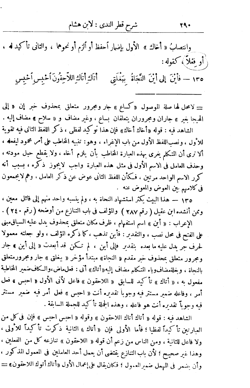وانتصاب أَخَاك الأول بإضمار احفظ أَو الزم أَو نَحْوهمَا وَالثَّانِي تَأْكِيد لَهُ أَو فعلا كَقَوْلِه فَأَيْنَ إِلَى أَيْن النجَاة ببغلتي أَتَاك أَتَاك اللاحقون احْبِسْ احْبِسْ