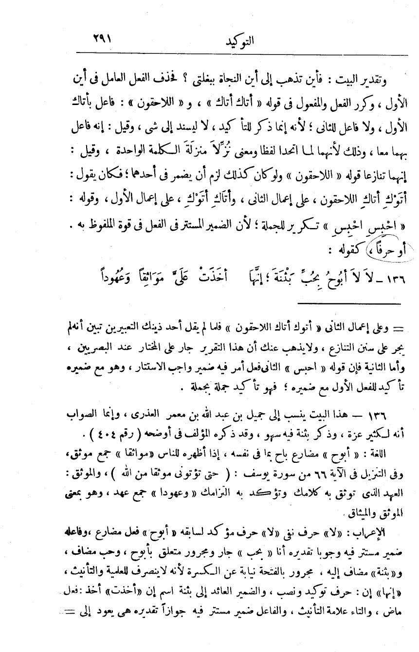 تَقْدِير الْبَيْت فَأَيْنَ تذْهب إِلَى أَيْن النجَاة ببغلتي فَحذف الْفِعْل الْعَامِل فِي أَيْن الأول وَكرر الْفِعْل وَالْمَفْعُول فِي قَوْله أَتَاك أَتَاك واللاحقون فَاعل بأتاك الأول وَلَا فَاعل للثَّانِي لِأَنَّهُ إِنَّمَا ذكر للتَّأْكِيد لَا ليسند إِلَى شَيْء وَقيل إِنَّه فَاعل بهما مَعًا وَذَلِكَ لِأَنَّهُمَا لما اتحدا لفظا وَمعنى نزلا منزلَة الْكَلِمَة الْوَاحِدَة وَقيل إنَّهُمَا تنَازعا قَوْله اللاحقون وَلَو كَانَ كَذَلِك لزم أَن يضمر فِي أَحدهمَا فَكَانَ يَقُول أتوك أَتَاك اللاحقون على إِعْمَال الثَّانِي وأتاك أتوك على إِعْمَال الأول وَقَوله احْبِسْ احْبِسْ تَكْرِير للجملة لِأَن الضَّمِير الْمُسْتَتر فِي الْفِعْل فِي قُوَّة الملفوظ بِهِ أَو حرفا كَقَوْلِه لَا لَا أبوح بحب بثنة إِنَّهَا أخذت عَليّ مواثقا وعهودا