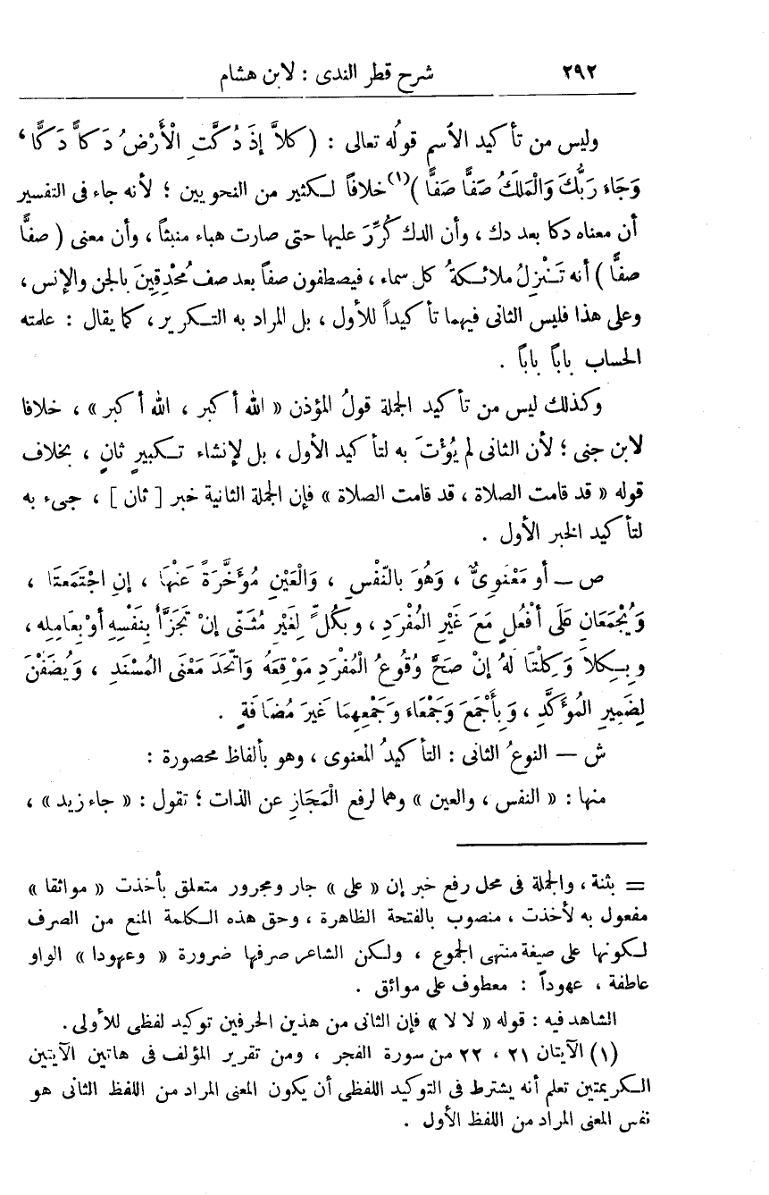 وَلَيْسَ من تَأْكِيد الِاسْم قَوْله تَعَالَى كلا إِذا دكت الأَرْض دكا دكا وَجَاء رَبك والمل صفا صفا خلافًا لكثير من النَّحْوِيين لِأَنَّهُ جَاءَ فِي التَّفْسِير أَن مَعْنَاهُ دكا بعد دك وَأَن الدك كرر عَلَيْهَا حَتَّى صَارَت هباء منبثا وَأَن معنى صفا صفا أَنه تنزل مَلَائِكَة كل سَمَاء فيصطفون صفا بعد صف محدقين بالجن وَالْإِنْس وعَلى هَذَا فَلَيْسَ الثَّانِي فِيهِ تَأْكِيدًا للْأولِ بل المُرَاد بِهِ التكرير كَمَا يُقَال عَلمته الْحساب بَابا بَابا وَكَذَلِكَ لَيْسَ من تَأْكِيد الْجُمْلَة قَول الْمُؤَذّن الله أكبر الله أكبر خلافًا لِابْنِ جني لِأَن الثَّانِي لم يُؤْت بِهِ لتأكيد الأول بل لإنشاء تَكْبِير ثَان بِخِلَاف قَوْله قد قَامَت الصَّلَاة قد قَامَت الصَّلَاة فَإِن الْجُمْلَة الثَّانِيَة خبر ثَان جِيءَ بِهِ لتأكيد الْخَبَر الأول ص أَو معنوي وَهُوَ بِالنَّفسِ وَالْعين مؤخرة عَنْهَا إِن اجتمعتا وتجمعان على أفعل مَعَ غير الْمُفْرد وَبِكُل لغير مثنى إِن تجزأ بِنَفسِهِ أَو بعامله وبكلا وكلتا لَهُ إِن صَحَّ وُقُوع الْمُفْرد موقعه واتحد معنى الْمسند ويضفن لضمير الْمُؤَكّد وبأجمع وجمعاء وجمعهما غير مُضَافَة ش النَّوْع الثَّانِي التَّأْكِيد الْمَعْنَوِيّ وَهُوَ بِأَلْفَاظ محصورة مِنْهَا النَّفس وَالْعين وهما لرفع الْمجَاز عَن الذَّات تَقول جَاءَ زيد