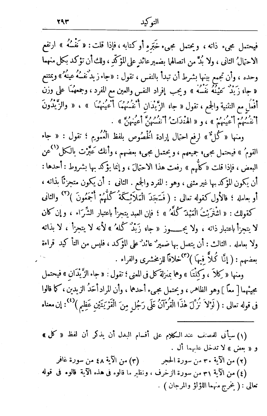 فَيحْتَمل مَجِيء ذَاته وَيحْتَمل مَجِيء خَبره أَو كِتَابه فَإِذا قلت نَفسه ارْتَفع الِاحْتِمَال الثَّانِي وَلَا بُد من اتصالهما بضمير عَائِد على الْمُؤَكّد وَذَلِكَ أَن تؤكد بِكُل مِنْهُمَا وَحده وَأَن تجمع بَينهمَا بِشَرْط أَن تبدأ بِالنَّفسِ تَقول جَاءَ زيد نَفسه عينه وَيمْتَنع جَاءَ زيد عينه نَفسه وَيجب إِفْرَاد النَّفس وَالْعين مَعَ الْمُفْرد وجمعهما على وزن أفعل مَعَ التَّثْنِيَة وَالْجمع تَقول جَاءَ الزيدان أَنفسهمَا أعينهما والزيدون أنفسهم أَعينهم والهندات أَنْفسهنَّ أعينهن وَمِنْهَا كل لرفع إِرَادَة الْخُصُوص بِلَفْظ الْعُمُوم تَقول جَاءَ الْقَوْم فَيحْتَمل مَجِيء جَمِيعهم وَيحْتَمل مَجِيء بَعضهم وَأَنَّك عبرت بِالْكُلِّ عَن الْبَعْض فَإِذا قلت كلهم رفعت هَذَا الِاحْتِمَال وَإِنَّمَا يُؤَكد بهَا بِشُرُوط أَحدهَا أَن يكون الْمُؤَكّد بهَا غير مثنى وَهُوَ الْمُفْرد وَالْجمع الثَّانِي أَن يكون متجزئا بِذَاتِهِ أَو بعامله فَالْأول كَقَوْلِه تَعَالَى فَسجدَ الْمَلَائِكَة كلهم أَجْمَعُونَ وَالثَّانِي كَقَوْلِك اشْتريت العَبْد كُله فَإِن العَبْد يتَجَزَّأ بِاعْتِبَار الشِّرَاء وَإِن كَانَ لَا يتَجَزَّأ بِاعْتِبَار ذَاته وَلَا يجوز جَاءَ زيد كُله لِأَنَّهُ لَا يتَجَزَّأ لَا بِذَاتِهِ وَلَا بعامله الثَّالِث أَن يتَّصل بهَا ضمير عَائِد على الْمُؤَكّد فَلَيْسَ من التَّأْكِيد قِرَاءَة بَعضهم إِنَّا كلا فِيهَا خلافًا للزمخشري والفرآء وَمِنْهَا كلا وكلتا وهما بِمَنْزِلَة كل فِي الْمَعْنى تَقول جَاءَ الزيدان فَيحْتَمل مجيئهما مَعًا وَهُوَ الظَّاهِر وَيحْتَمل مَجِيء أَحدهمَا وَأَن المُرَاد أحد الزيدين كَمَا قَالُوا فِي قَوْله تَعَالَى لَوْلَا نزل هَذَا الْقُرْآن على رجل من القريتي عَظِيم إِن مَعْنَاهُ