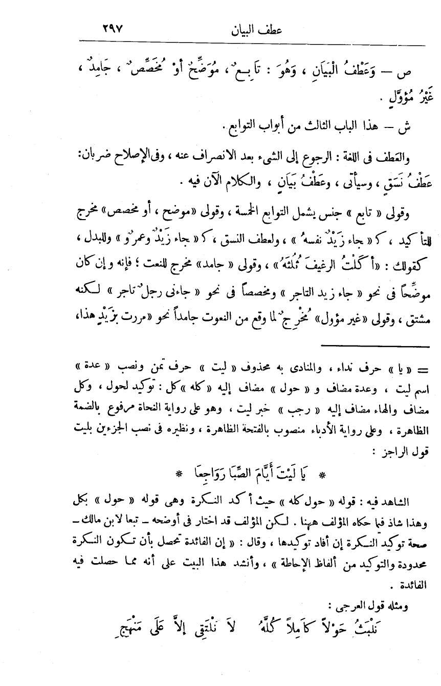 وَعطف الْبَيَان وَهُوَ تَابع موضح أَو مُخَصص جامد غير مؤول ش هَذَا الْبَاب الثَّالِث من أَبْوَاب التوابع والعطف فِي اللُّغَة الرُّجُوع إِلَى الشَّيْء بعد الِانْصِرَاف عَنهُ وَفِي الِاصْطِلَاح ضَرْبَان عطف نسق وَسَيَأْتِي وَعطف بَيَان وَالْكَلَام الْآن فِيهِ قولي تَابع جنس يَشْمَل التوابع الْخَمْسَة وَقَوْلِي موضح أَو مُخَصص مخرج للتَّأْكِيد ك جَاءَ زيد نَفسه ولعطف النسق ك جَاءَ زيد وَعَمْرو وللبدل كَقَوْلِك أكلت الرَّغِيف ثلثه وَقَوْلِي جامد مخرج للنعت فَإِنَّهُ وَإِن كَانَ موضحا فِي نَحْو جَاءَ زيد التَّاجِر ومخصصا فِي نَحْو جَاءَنِي رجل تَاجر لكنه مُشْتَقّ وَقَوْلِي غير مؤول مخرج لما وَقع من النعوت جَامِدا نَحْو مَرَرْت بزيد هَذَا وبقاع عرفج فَإِنَّهُ فِي تَأْوِيل الْمُشْتَقّ أَلا ترى أَن الْمَعْنى مَرَرْت بزيد الْمشَار إِلَيْهِ وبقاع خشن