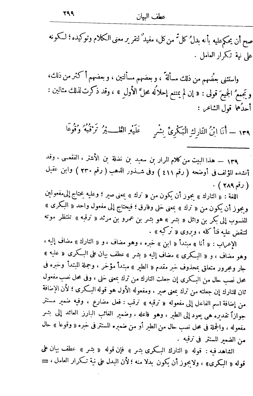 صَحَّ أَن يحكم عَلَيْهِ بِأَنَّهُ بدل كل من كل مُفِيد لتقرير معنى الْكَلَام وتوكيده لكَونه على نِيَّة تكْرَار الْعَامِل وَاسْتثنى بَعضهم من ذَلِك مَسْأَلَة وَبَعْضهمْ مَسْأَلَتَيْنِ وَبَعْضهمْ أَكثر من ذَلِك وَيجمع الْجَمِيع قولي إِن لم يمْتَنع إحلاله مَحل الأول وَقد ذكرت لذَلِك مثالين أَحدهمَا قَول الشَّاعِر أَنا ابْن التارك الْبكْرِيّ بشر عَلَيْهِ الطير ترقبه وقوعا