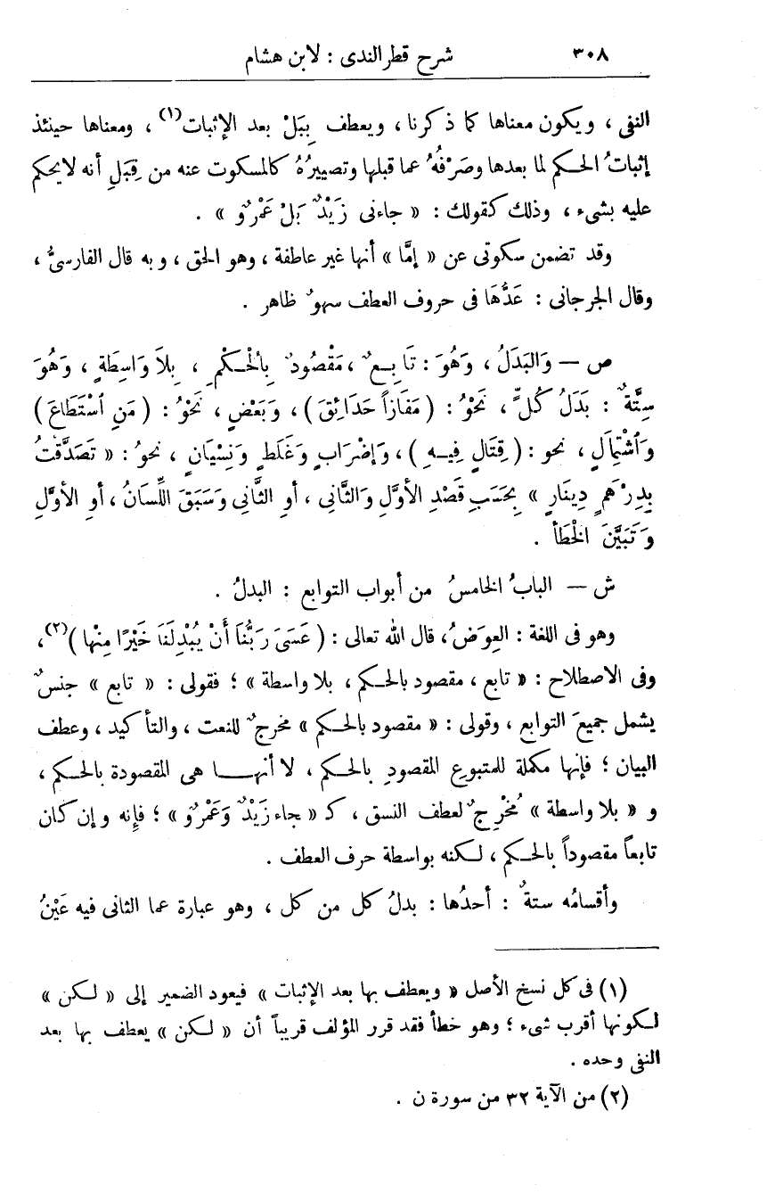ويعطف ببل بعد الْإِثْبَات وَمَعْنَاهَا حِينَئِذٍ إِثْبَات الحكم لما بعْدهَا وَصَرفه عَمَّا قبلهَا وتصييره كالمسكوت عَنهُ من قبل أَنه لَا يحكم عَلَيْهِ بِشَيْء وَذَلِكَ كَقَوْلِك جَاءَنِي زيد بل عَمْرو وَقد تضمن سكوتي عَن إِمَّا أَنَّهَا غير عاطفة وَهُوَ الْحق وَبِه قَالَ الْفَارِسِي وَقَالَ الْجِرْجَانِيّ عدهَا فِي حُرُوف الْعَطف سَهْو ظَاهر ص وَالْبدل وَهُوَ تَابع مَقْصُود بالحكم بِلَا وَاسِطَة وَهُوَ سِتَّة بدل كل نَحْو مفازا حدائق وَبَعض نَحْو من اسْتَطَاعَ واشتمال نَحْو قتال فِيهِ وإضراب وَغلط ونسيان نَحْو تَصَدَّقت بدرهم دِينَار بِحَسب قصد الأول وَالثَّانِي أَو الثَّانِي وَسبق اللِّسَان أَو الأول وَتبين الْخَطَأ
