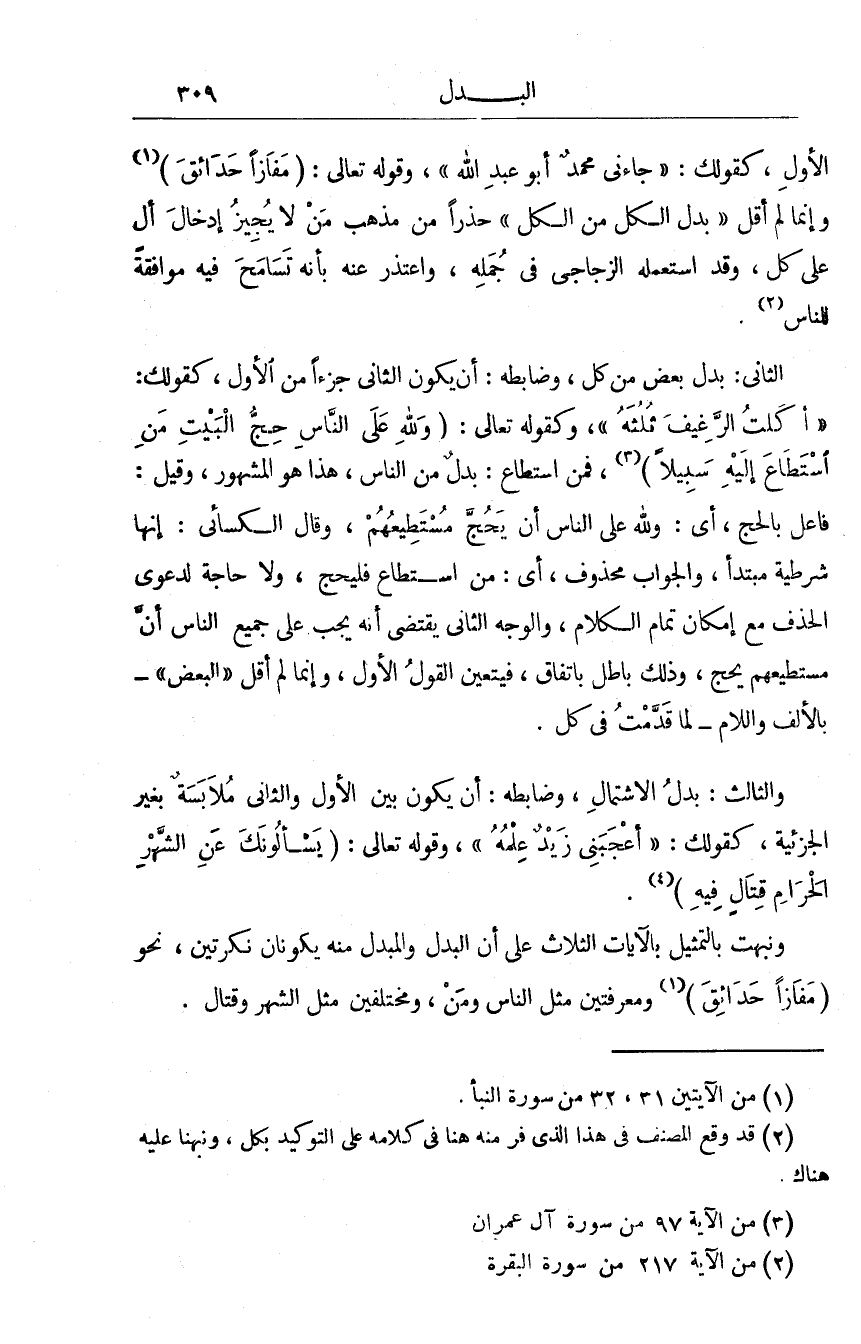 الأول كَقَوْلِك جَاءَنِي مُحَمَّد أَبُو عبد الله وَقَوله تَعَالَى مفازا حدائق وَإِنَّمَا لم أقل بدل الْكل من الْكل حذرا من مَذْهَب من لَا يُجِيز إِدْخَال أل على كل وَقد اسْتَعْملهُ الزجاجي فِي جمله وَاعْتذر عَنهُ بِأَنَّهُ تسَامح فِيهِ مُوَافقَة للنَّاس الثَّانِي بدل بعض من كل وضابطه أَن يكون الثَّانِي جُزْءا من الأول كَقَوْلِك أكلت الرَّغِيف ثلثه وَكَقَوْلِه تَعَالَى وَللَّه على النَّاس حج الْبَيْت من اسْتَطَاعَ إِلَيْهِ سَبِيلا فَمن اسْتَطَاعَ بدل من النَّاس هَذَا هُوَ الْمَشْهُور وَقيل فَاعل بِالْحَجِّ أَي وَللَّه على النَّاس أَن يحجّ مستطيعهم وَقَالَ الْكسَائي إِنَّهَا شَرْطِيَّة مُبْتَدأ وَالْجَوَاب مَحْذُوف أَي من اسْتَطَاعَ فليحج وَلَا حَاجَة لدعوى الْحَذف مَعَ إِمْكَان تَمام الْكَلَام وَالْوَجْه الثَّانِي يَقْتَضِي أَنه يجب على جَمِيع النَّاس أَن مستطيعهم يحجّ وَذَلِكَ بَاطِل بِاتِّفَاق فَيتَعَيَّن القَوْل الأول وَإِنَّمَا لم أقل الْبَعْض بِالْألف وَاللَّام لما قدمت فِي كل وَالثَّالِث بدل الاشتمال وضابطه أَن يكون بَين الأول والثان مُلَابسَة بِغَيْر الْجُزْئِيَّة كَقَوْلِك أعجبني زيد علمه وَقَوله تَعَالَى يَسْأَلُونَك عَن الشَّهْر الْحَرَام قتال فِيهِ ونبهت بالتمثيل بِالْآيَاتِ الثَّلَاث على أَن الْبَدَل والمبدل مِنْهُ يكونَانِ نكرتين نَحْو قَوْله تَعَالَى مفازا حدائق ومعرفتين مثل النَّاس وَمن ومختلفين مثل الشَّهْر وقتال