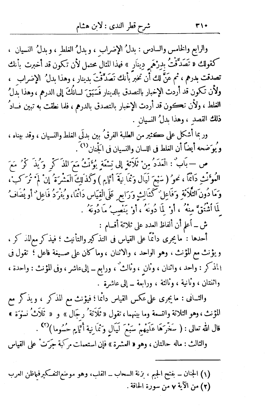 ص بَاب الْعدَد من ثَلَاثَة إِلَى تِسْعَة يؤنث مَعَ الْمُذكر وَيذكر مَعَ الْمُؤَنَّث دَائِما نَحْو سبع لَيَال وَثَمَانِية أَيَّام وَكَذَلِكَ الْعشْرَة إِن لم تركب وَمَا دون الثَّلَاثَة وفاعل كثالث ورابع على الْقيَاس دَائِما ويفرد فَاعل أَو يُضَاف لما اشتق مِنْهُ أَو لما دونه أَو ينصب مَا دونه ش اعْلَم أَن أَلْفَاظ الْعدَد على ثَلَاثَة أَقسَام أَحدهَا مَا يجْرِي دَائِما على الْقيَاس فِي التَّذْكِير والتأنيث فيذكر مَعَ الْمُذكر وَيُؤَنث مَعَ الْمُؤَنَّث وَهُوَ الْوَاحِد والاثنان وَمَا كَانَ على صِيغَة فَاعل تَقول فِي الْمُذكر وَاحِد وَاثْنَانِ وثان وثالث ورابع إِلَى عَاشر وَفِي الْمُؤَنَّث وَاحِدَة وَاثْنَتَانِ وثانية وثالثة ورابعة إِلَى عاشرة وَالثَّانِي مَا يجْرِي على عكس الْقيَاس دَائِما فيؤنث مَعَ الْمُذكر وَيذكر مَعَ الْمُؤَنَّث وَهُوَ الثَّلَاثَة والتسعة وَمَا بَينهمَا تَقول ثَلَاثَة رجال وَثَلَاث نسْوَة قَالَ تَعَالَى سخرها عَلَيْهِم سبع لَيَال وَثَمَانِية أَيَّام حسوما