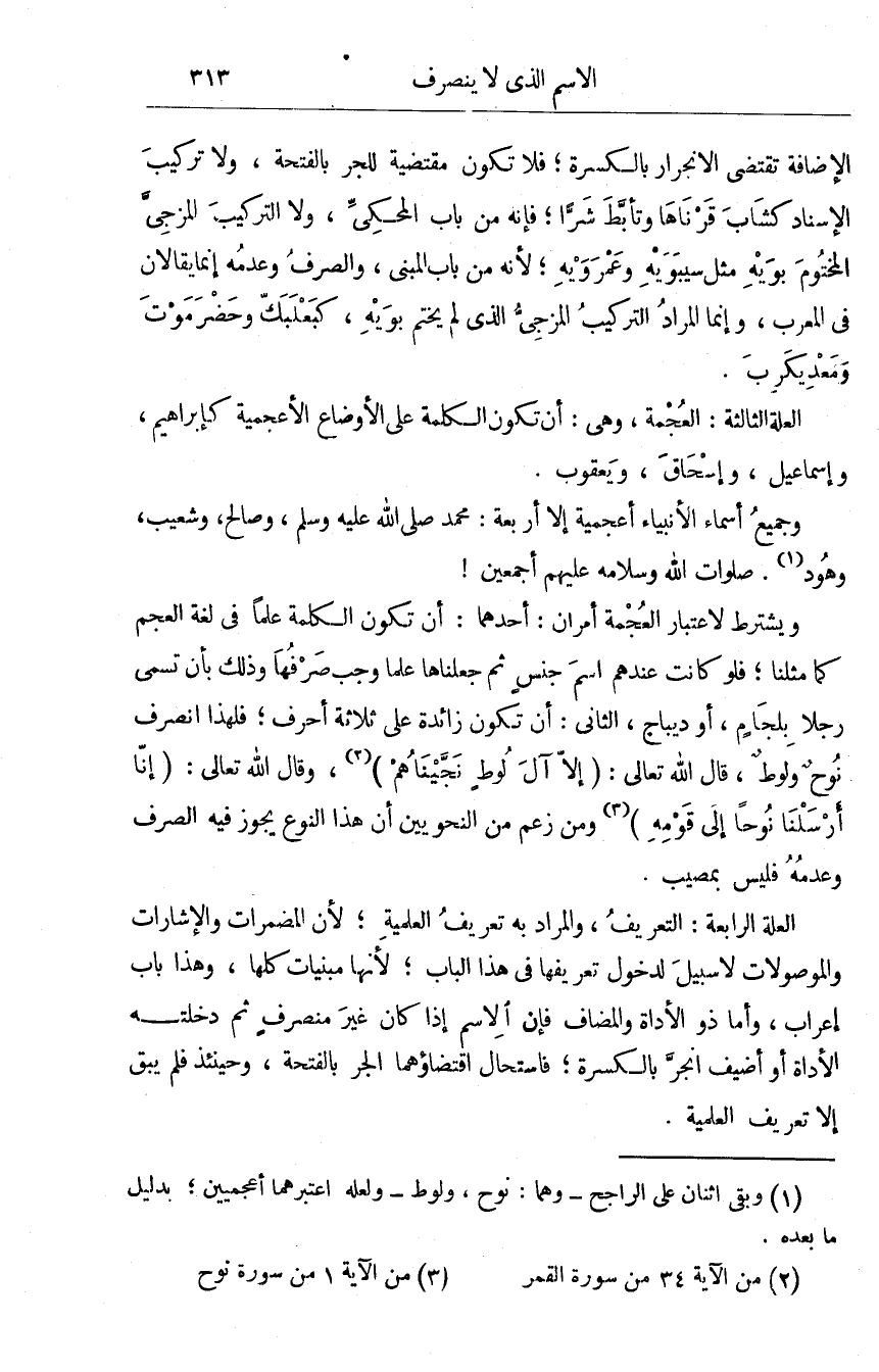 وَهِي أَن تكون الْكَلِمَة على الأوضاع الأعجمية كإبراهيم وَإِسْمَاعِيل وَإِسْحَاق وَيَعْقُوب وَجَمِيع أَسمَاء الْأَنْبِيَاء أَعْجَمِيَّة إِلَّا أَرْبَعَة مُحَمَّد صلى الله عَلَيْهِ وَسلم وَصَالح وَشُعَيْب وَهود صلوَات الله وَسَلَامه عَلَيْهِم أَجْمَعِينَ وَيشْتَرط لاعْتِبَار العجمة أَمْرَانِ أَحدهمَا أَن تكون الْكَلِمَة علما فِي لُغَة الْعَجم كَمَا مثلنَا فَلَو كَانَت عِنْدهم اسْم جنس ثمَّ جعلناها علما وَجب صرفهَا وَذَلِكَ بِأَن تسمي رجلا بلجام أَو ديباج الثَّانِي أَن تكون زَائِدَة على ثَلَاثَة أحرف فَلهَذَا انْصَرف نوح وَلُوط قَالَ الله تَعَالَى إِلَّا آل لوط نجيناهم وَقَالَ الله تَعَالَى إِنَّا أرسلنَا نوحًا إِلَى قومه وَمن زعم من النَّحْوِيين أَن هَذَا النَّوْع يجوز فِيهِ الصّرْف وَعَدَمه فَلَيْسَ بمصيب