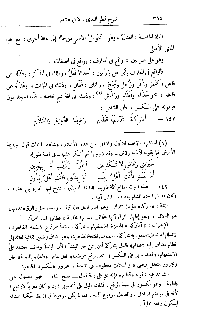 وَهُوَ تَحْويل الِاسْم من حَالَة إِلَى حَالَة أُخْرَى مَعَ بَقَاء الْمَعْنى الْأَصْلِيّ وَهُوَ على ضَرْبَيْنِ وَاقع فِي المعارف وواقع فِي الصِّفَات فالواقع فِي المعارف يَأْتِي على وزنين أَحدهمَا فعل وَذَلِكَ فِي الْمُذكر وعدله عَن فَاعل كعمر وَزفر وزحل وَجمع وَالثَّانِي فعال وَذَلِكَ فِي الْمُؤَنَّث وعدله عَن فَاعله نَحْو حذام وقطام ورقاش وَذَلِكَ فِي لُغَة تَمِيم خَاصَّة فَأَما الحجازيون فينبونه على الْكسر قَالَ الشَّاعِر اتاركة تدللها قطام رَضِينَا بالتحية وَالسَّلَام