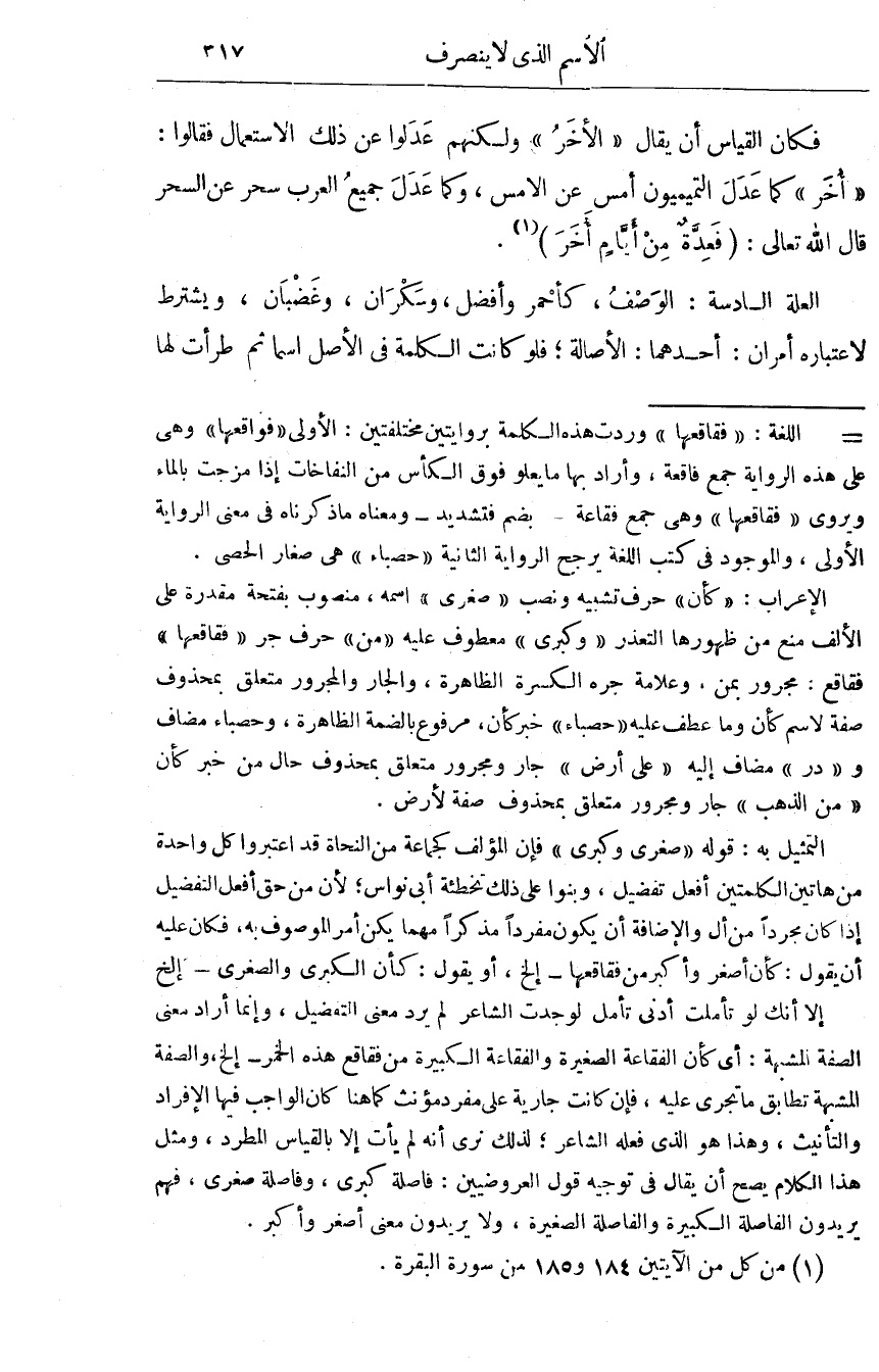 فَكَانَ الْقيَاس أَن يُقَال الْأُخَر وَلَكنهُمْ عدلوا عَن ذَلِك الِاسْتِعْمَال فَقَالُوا أخر كَمَا عدل التَّمِيمِيُّونَ الأمس عَن الأمس وكما عدل جَمِيع الْعَرَب سحر عَن السحر قَالَ الله تَعَالَى فَعدَّة من أَيَّام أخر