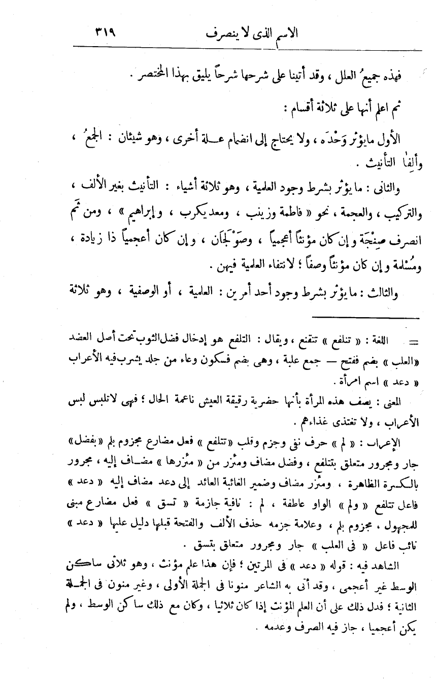 فَهَذِهِ جَمِيع الْعِلَل وَقد أَتَيْنَا على شرحها شرحا يَلِيق بِهَذَا الْمُخْتَصر ثمَّ اعْلَم أَنَّهَا ثَلَاثَة أَقسَام الأول مَا يُؤثر وَحده وَلَا يحْتَاج إِلَى انضمام عِلّة أُخْرَى وَهُوَ شَيْئَانِ الْجمع وألفا التَّأْنِيث وَالثَّانِي مَا يُؤثر بِشَرْط وجود العلمية وَهُوَ ثَلَاثَة أَشْيَاء التَّأْنِيث بِغَيْر الْألف والتركيب والعجمة نَحْو فَاطِمَة وَزَيْنَب ومعديكرب وابراهيم وَمن ثمَّ انْصَرف صنجه وان كَانَ مؤنثا أعجميا وصولجان وَإِن كَانَ أعجميا ذَا زِيَادَة ومسلمة وَإِن كَانَ مؤنثا وَصفا لانتقاء العلمية فِيهِنَّ الثَّالِث مَا يُؤثر بِشَرْط وجود أحد أَمريْن العلمية أَو الوصفية وَهُوَ ثَلَاثَة