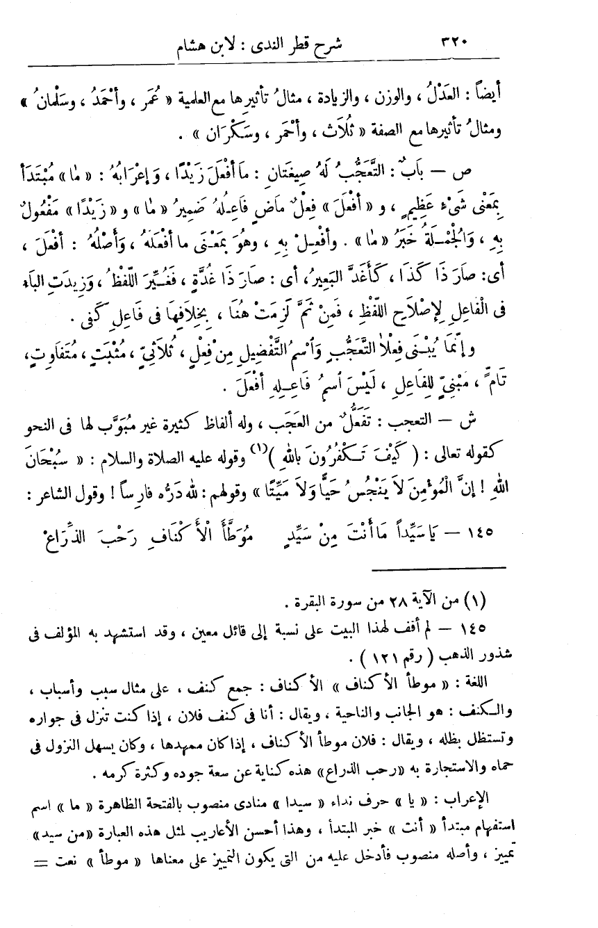 ص بَاب التَّعَجُّب لَهُ صيغتان مَا أفعل زيدا وَإِعْرَابه مَا مُبْتَدأ بِمَعْنى شَيْء عَظِيم وأفعل فعل مَاض فَاعله ضمير مَا زيدا مفعول بِهِ وَالْجُمْلَة خبر مَا وأفعل بِهِ وَهُوَ بِمَعْنى مَا أَفعلهُ وَأَصله أفعل أَي صَار ذَا كَذَا كاغد الْبَعِير أَي صَار ذَا غُدَّة فَغير اللَّفْظ وزيدت الْبَاء فِي الْفَاعِل لإِصْلَاح اللَّفْظ فَمن ثمَّ لَزِمت هُنَا بِخِلَافِهَا فِي فَاعل كفى وَإِنَّمَا يبْنى فعلا التَّعَجُّب وَاسم التَّفْضِيل من فعل ثلاثي مُثبت متفاوت تَامّ مَبْنِيّ للْفَاعِل لَيْسَ اسْم فَاعله على أفعل ش التَّعَجُّب تفعل من الْعجب وَله أَلْفَاظ كَثِيرَة غير مبوب لَهَا فِي النَّحْو كَقَوْلِه تَعَالَى كَيفَ تكفرون بِاللَّه وَقَوله عَلَيْهِ الصَّلَاة وَالسَّلَام سُبْحَانَ الله إِن الْمُؤمن لَا ينجس حَيا وَلَا مَيتا وَقَوْلهمْ لله دره فَارِسًا وَقَول الشَّاعِر يَا سيدا مَا أَنْت من سيد موطا الأكناف رحب الذِّرَاع