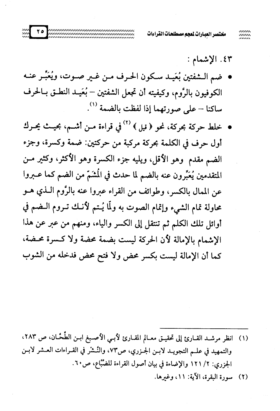 * ضم الشفتين بُعَيد سكون الحرف من غير صوت، ويُعَبِّر عنه الكوفيون بالرَّوم، وكيفيته أن تجعل الشفتين -بُعَيد النطق بالحرف ساكناً- على صورتهما إذا لفظت بالضمة.