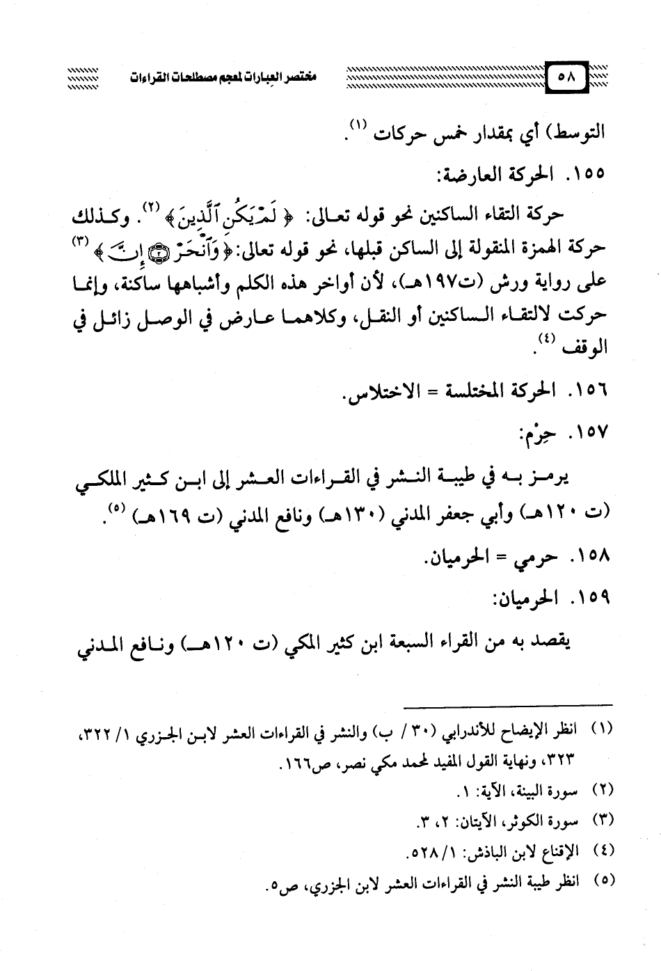 حركة التقاء الساكنين نحو قوله تعالى: {لَمْ يَكُنِ الَّذِينَ}. وكذلك حركة الهمزة المنقولة إلى الساكن قبلها، نحو قوله تعالى: {وَانْحَرْ (2) إِنَّ} على رواية ورش (ت 197 هـ)، لأن أواخر هذه الكلم وأشباهها ساكنة، وإنما حركت لالتقاء الساكنين أو النقل، وكلاهما عارض في الوصل زائل في الوقف.