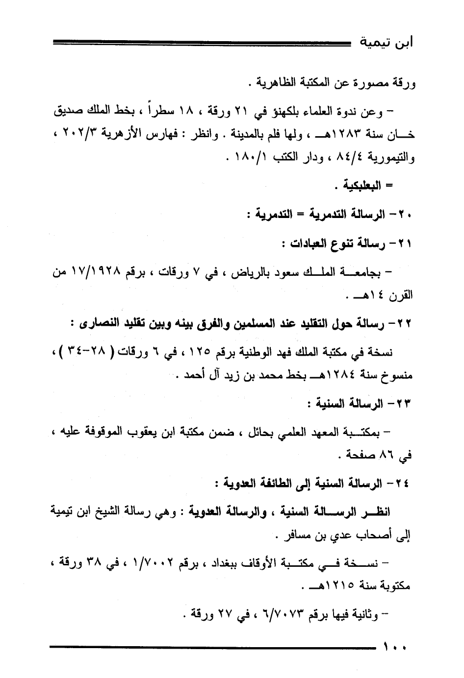 - وعن ندوة العلماء بلكهنؤ في 21 ورقة، 18 سطراً، بخط الملك صديق خان سنة 1283هـ، ولها فلم بالمدينة. وانظر: فهارس الأزهرية 3/202، والتيمورية 4/84، ودار الكتب 1/180.