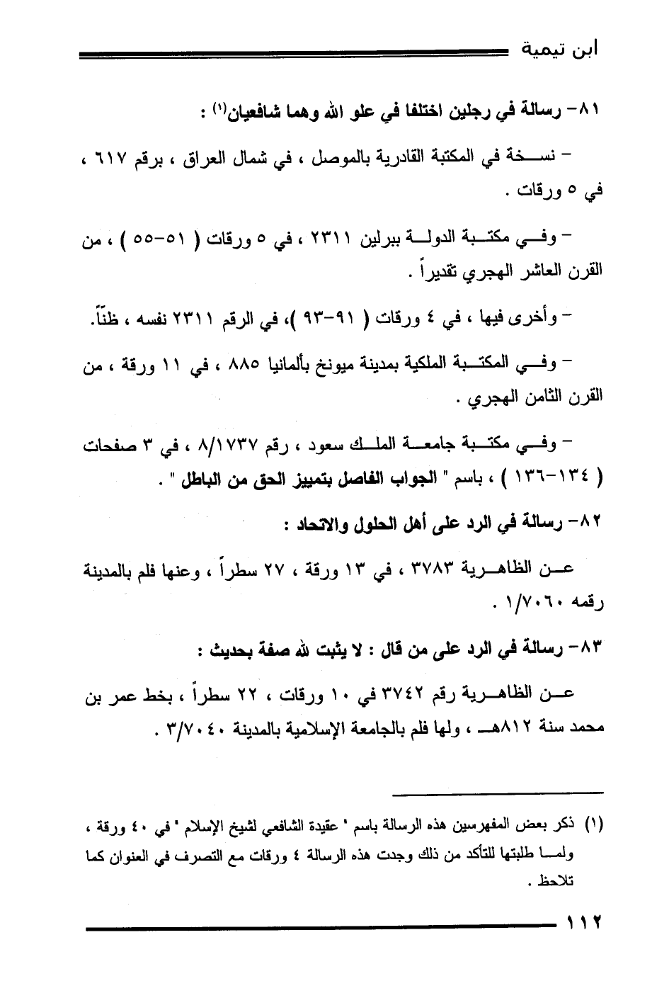 (1) ذكر بعض المفهرسين هذه الرسالة باسم " عقيدة الشافعي لشيخ الإسلام " في 40 ورقة، ولما طلبتها للتأكد من ذلك وجدت هذه الرسالة 4 ورقات مع التصرف في العنوان كما تلاحظ.