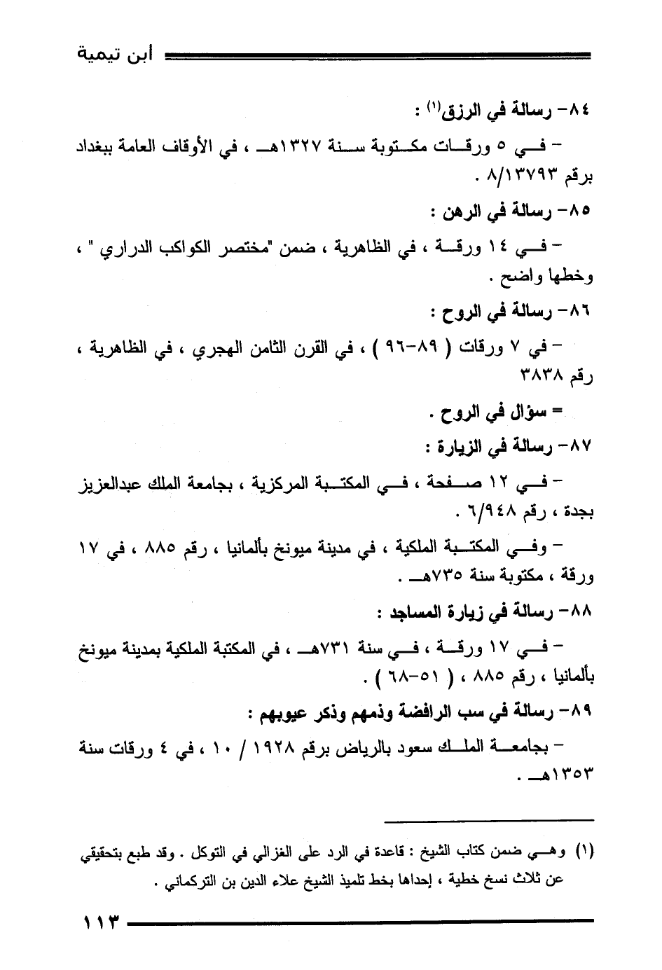 (1) وهي ضمن كتاب الشيخ: قاعدة في الرد على الغزالي في التوكل. وقد طبع بتحقيقي عن ثلاث نسخ خطية، إحداها بخط تلميذ الشيخ علاء الدين بن التركماني.