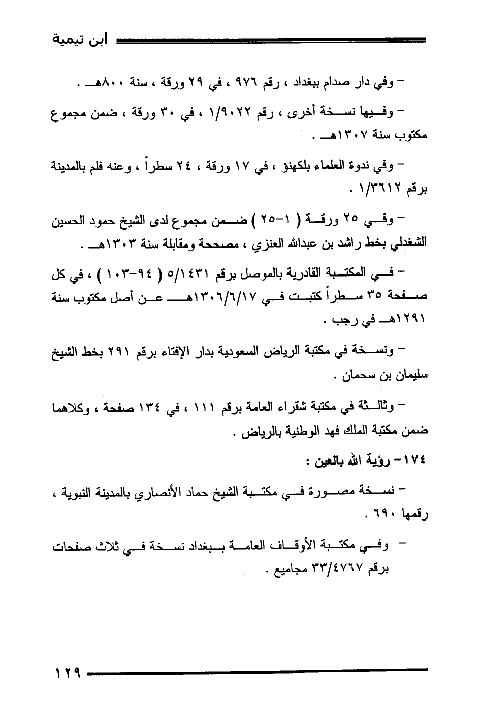 - وفي 25 ورقة (1-25) ضمن مجموع لدى الشيخ حمود الحسين الشغدلي بخط راشد بن عبد الله العنزي، مصححة ومقابلة سنة 1303هـ.